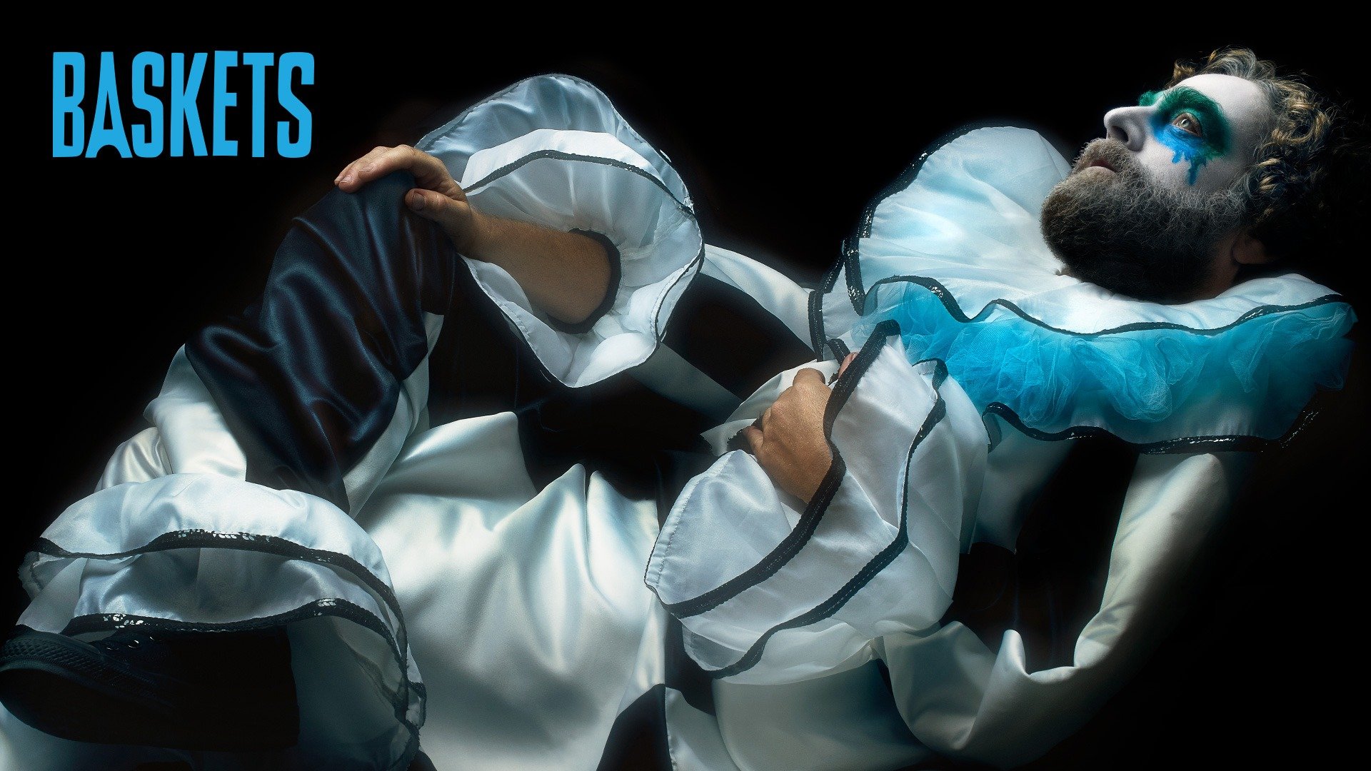 Description: A man with a beard and blue makeup is dressed in a white suit and blue and black mask and is laying on his back.