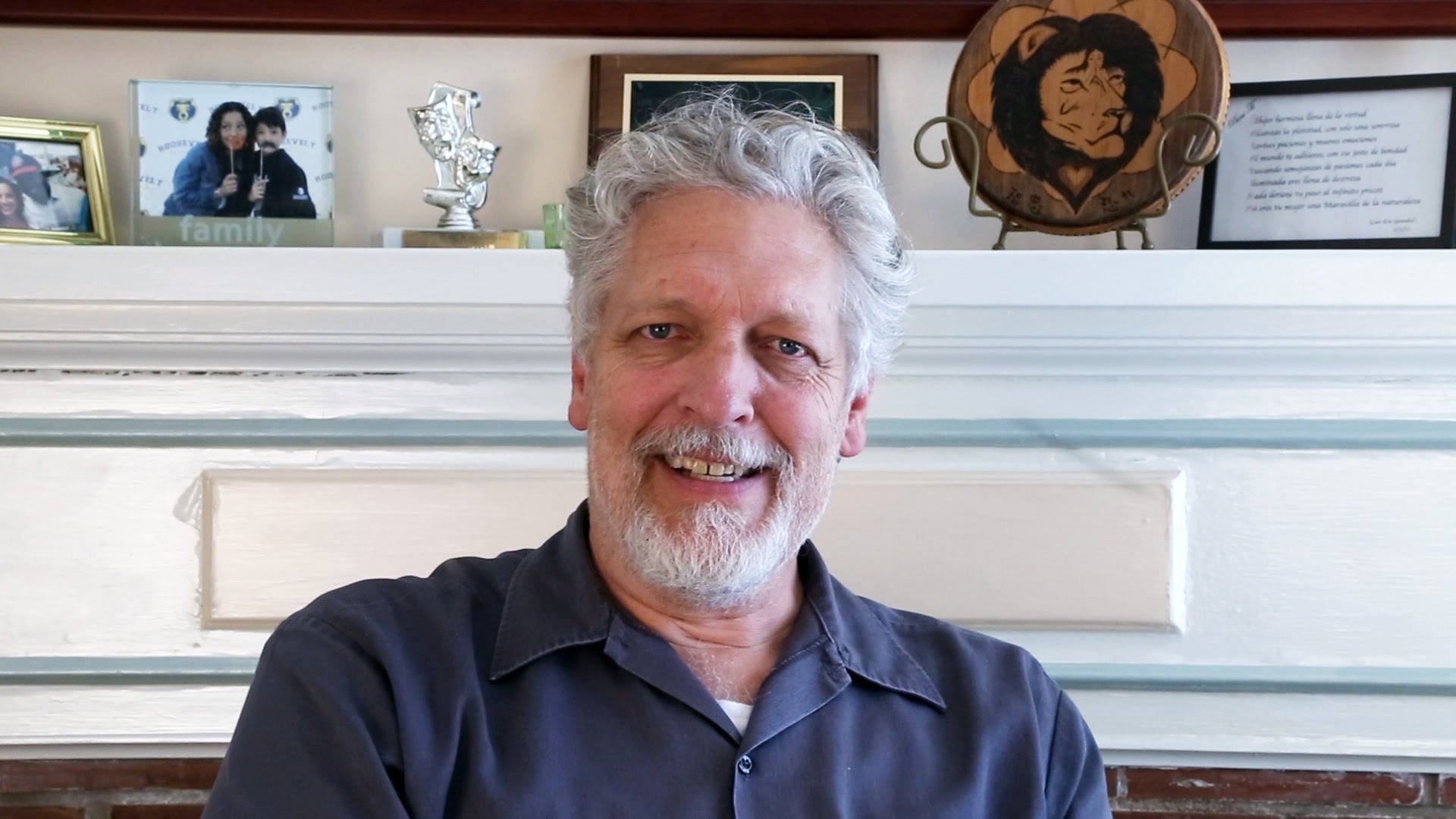 Description: A man with a beard and a blue shirt is smiling for the camera in front of a fireplace with pictures on it.