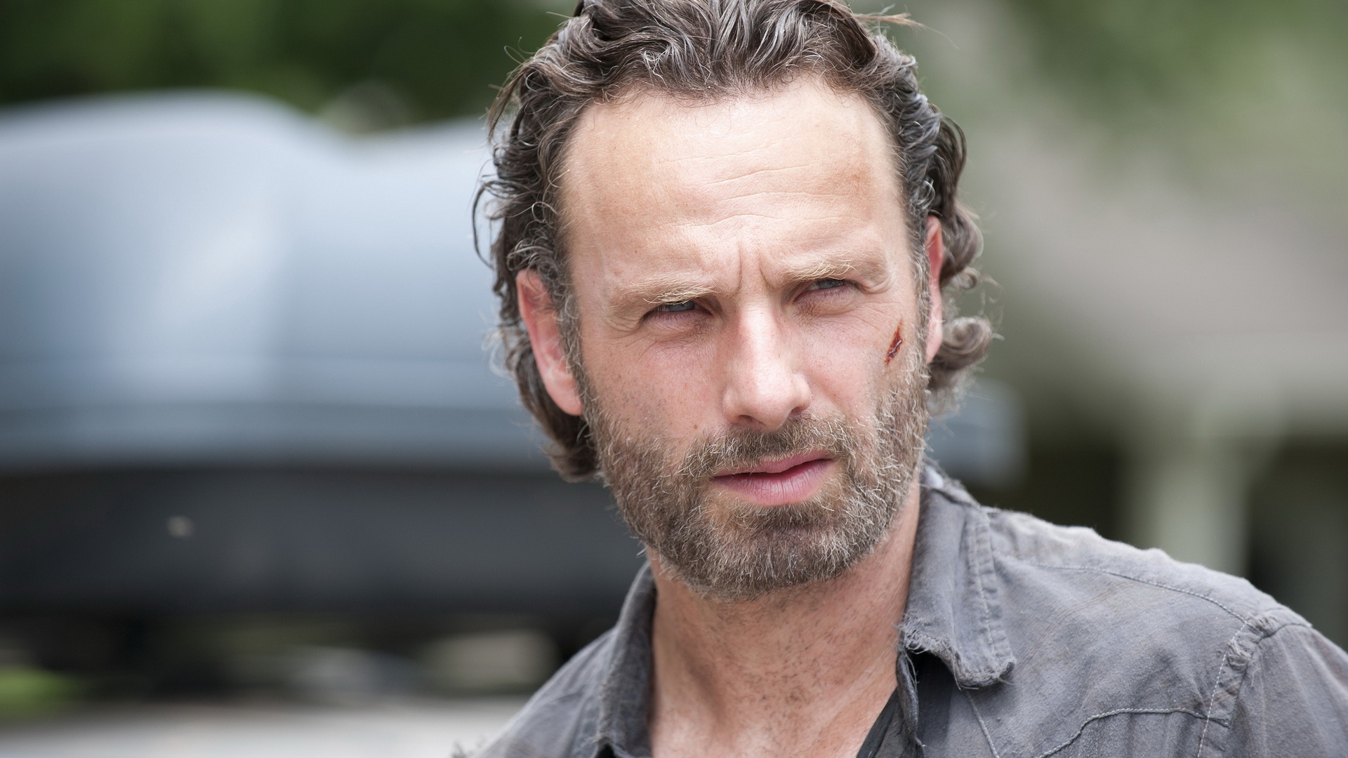 Description: A man with a beard and a gray shirt looks at the camera with a serious look on his face.