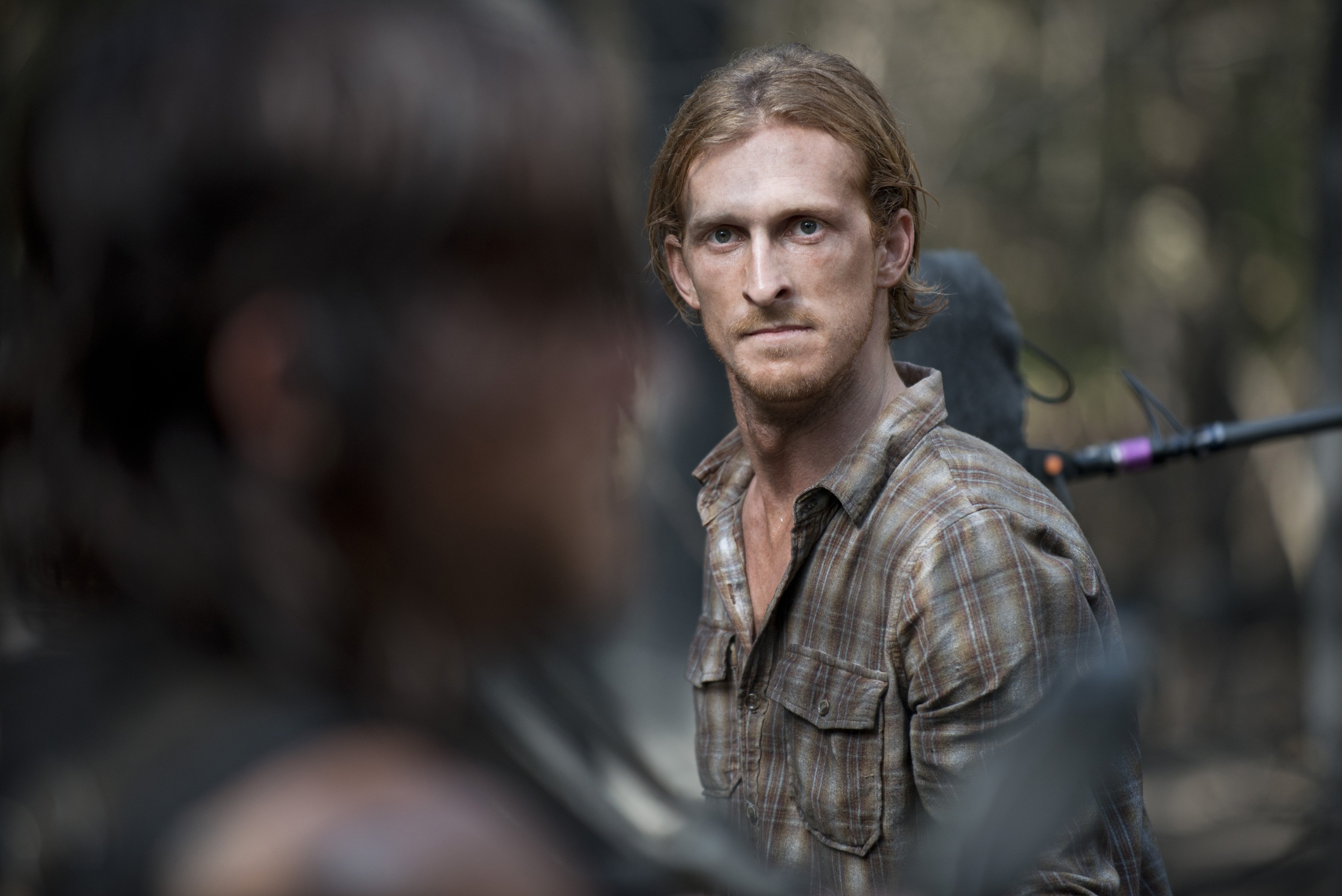 Description: A man with a beard and a plaid shirt is standing in front of a man with a gun in his hand.