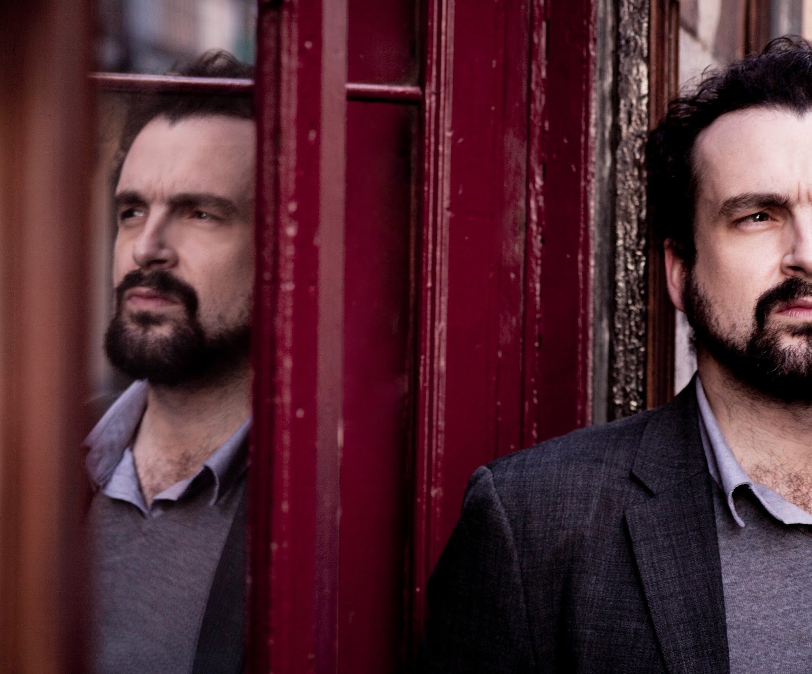 Description: A man with a beard standing in front of a red door with a mirror behind him and another man with a beard.