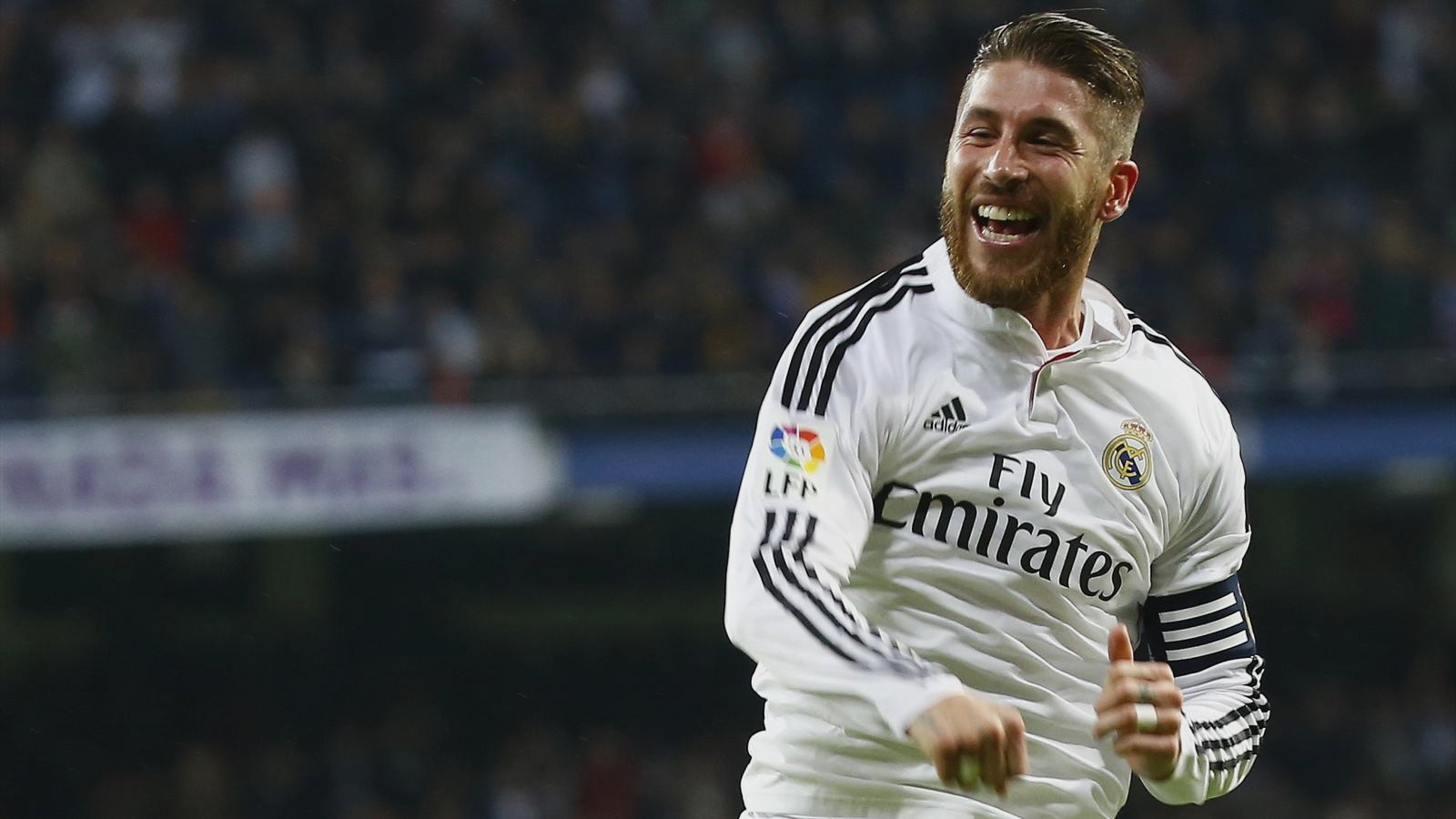 Description: A man with a beard and a beard running in a soccer field with a crowd watching him from the stands.