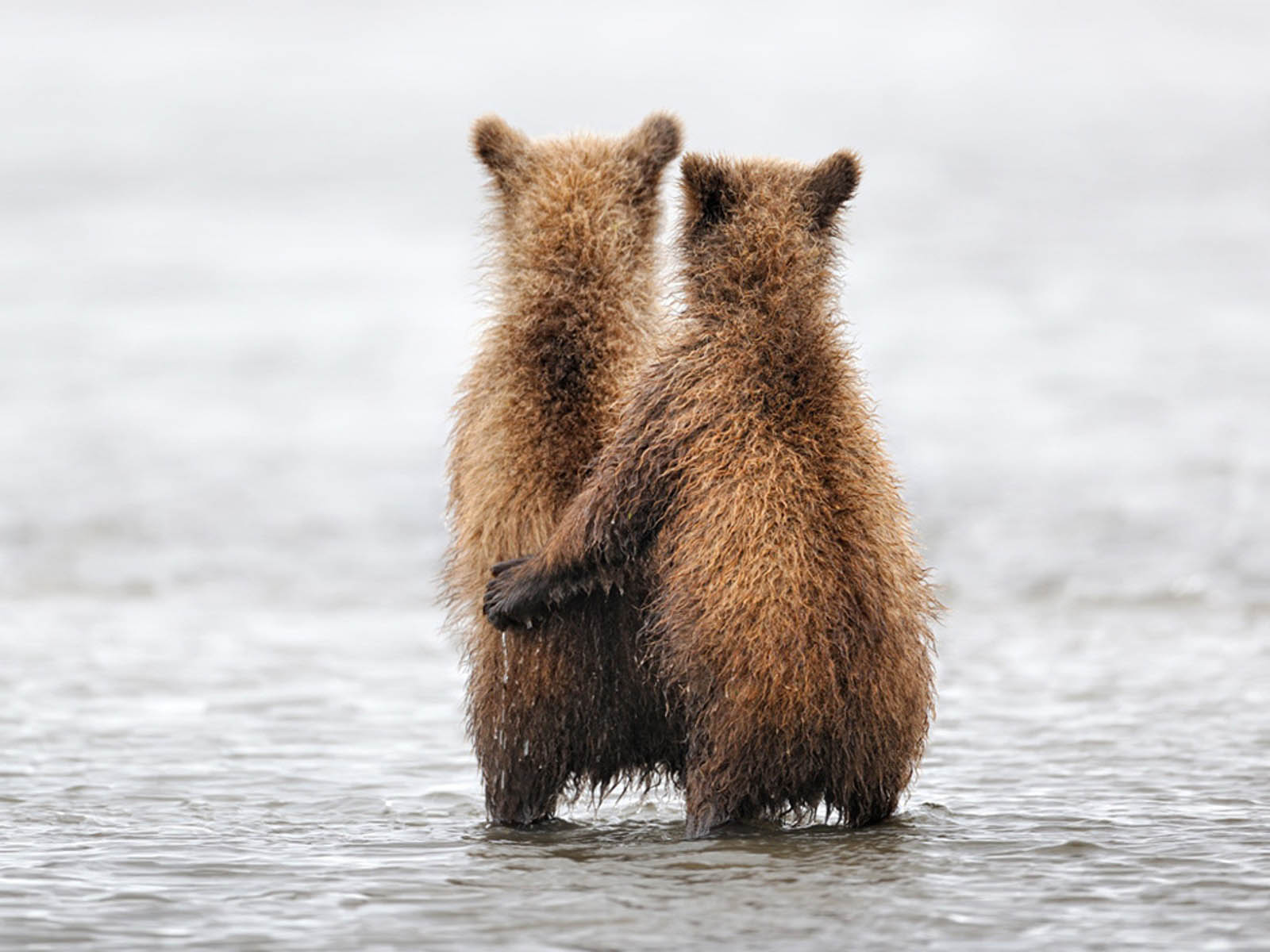 Description: Two bears standing in the water looking at each other's back legs and arms.