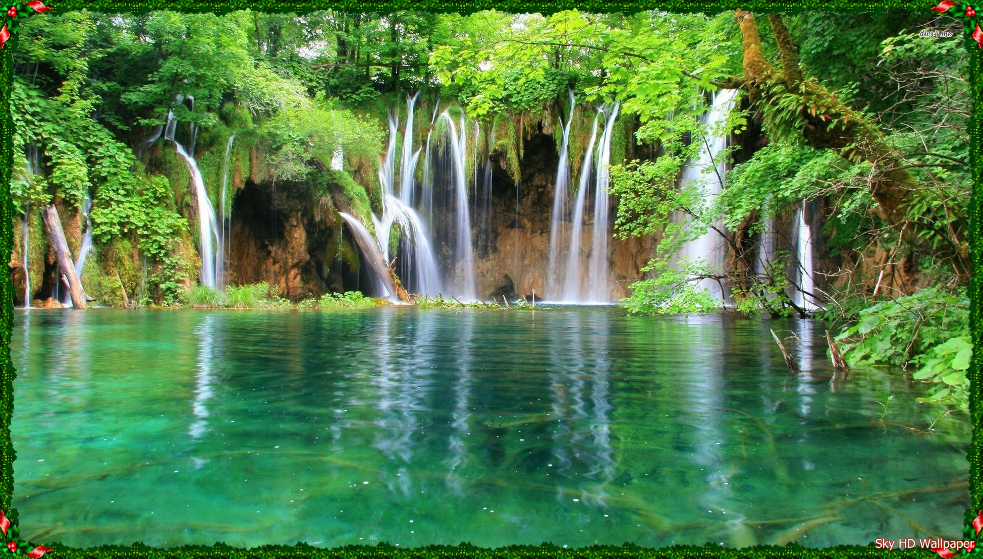 Description: A beautiful waterfall with a green frame around it and a lake in the middle of it with clear blue water.