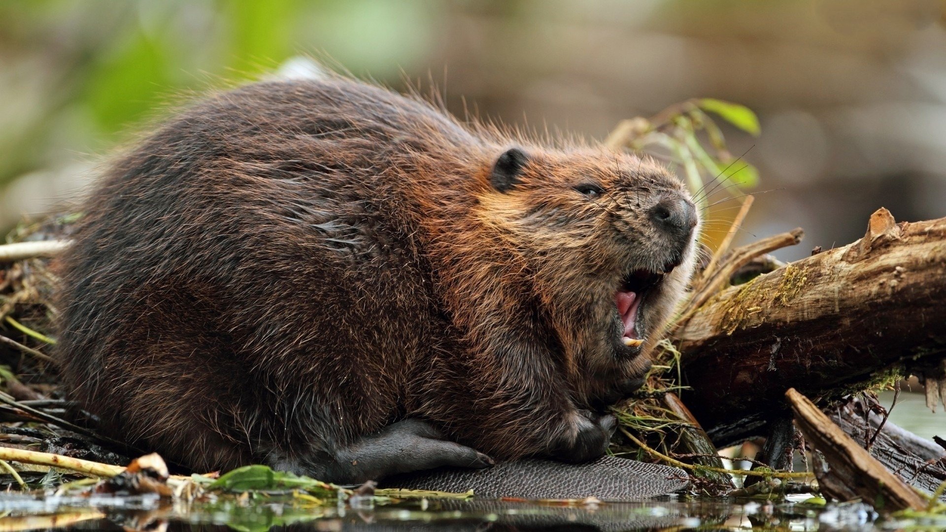 Description: A beaver yawns while sitting on a log in the water and yawns with its mouth open.