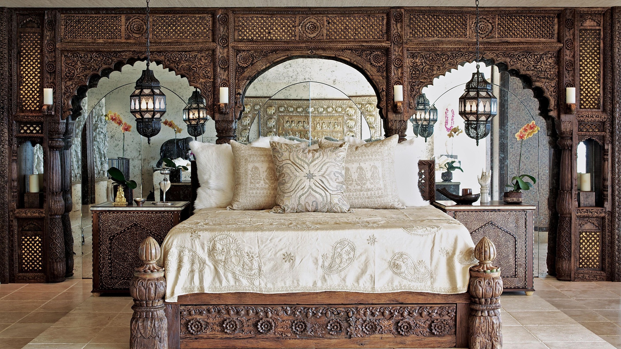 Description: A bed with a wooden headboard and a mirror above it with lights on either side of it and a lamp on the other side of the bed.