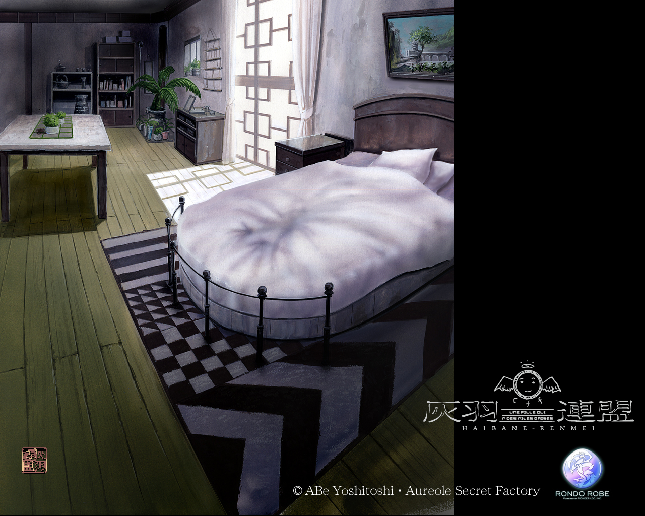 Description: A bedroom with a bed and a table in it and a checkered rug on the floor and a painting of a room with a table and chairs.