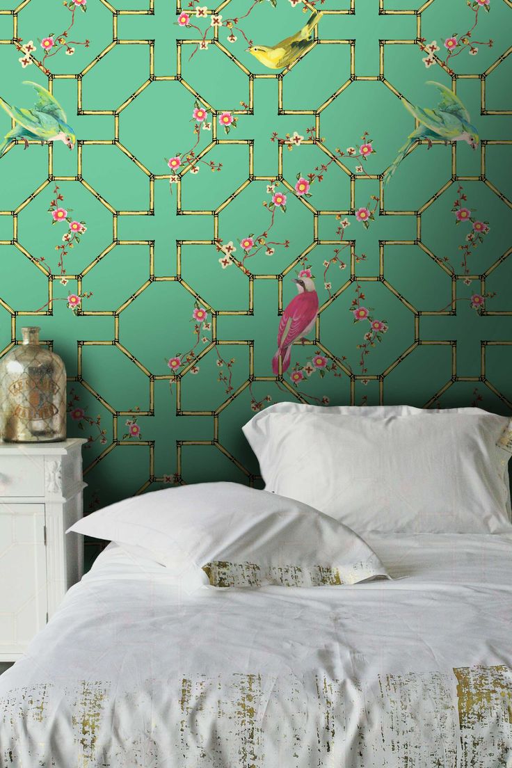 Description: A bed with a white comforter and a green wallpaper with birds on it and a white nightstand.