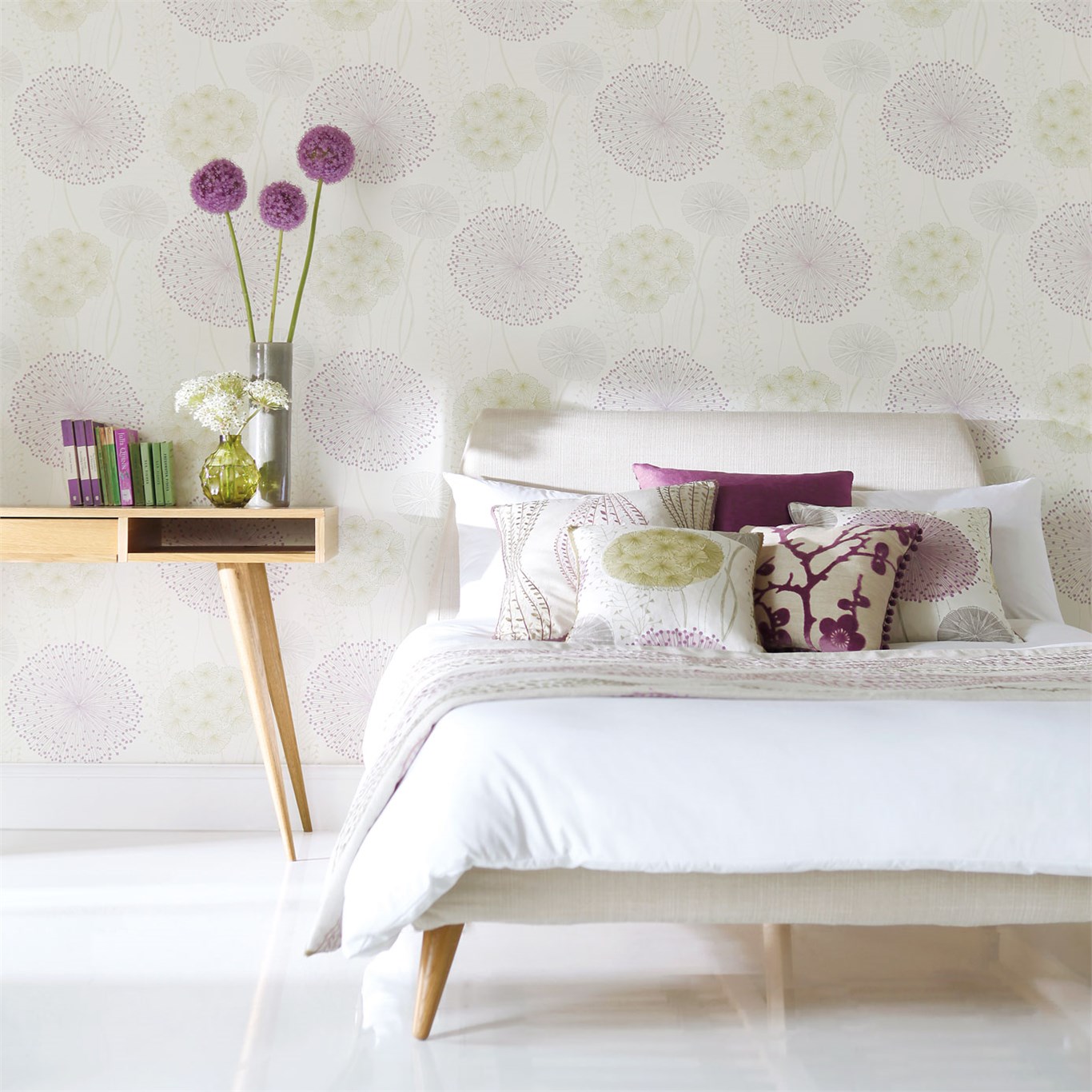 Description: A bed with a white comforter and pillows on it next to a nightstand with a flower vase on it.