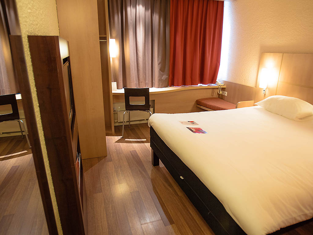 Description: A bed sitting in a bedroom next to a window with red curtains on it and a chair next to it.