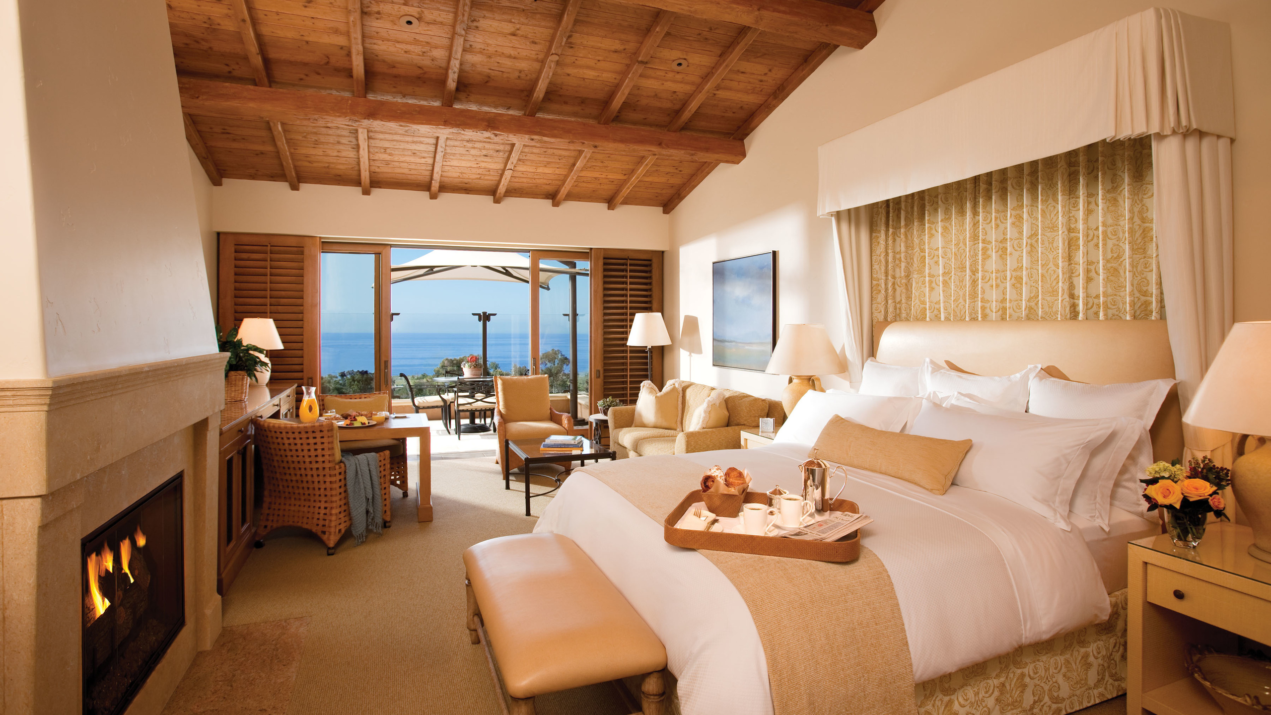 Description: A bedroom with a fireplace and a bed with a tray of food on it and a chair in front of it.