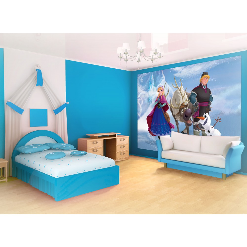 Description: A bedroom with a frozen princess mural on the wall and a bed with a blue comforter and a white sofa.
