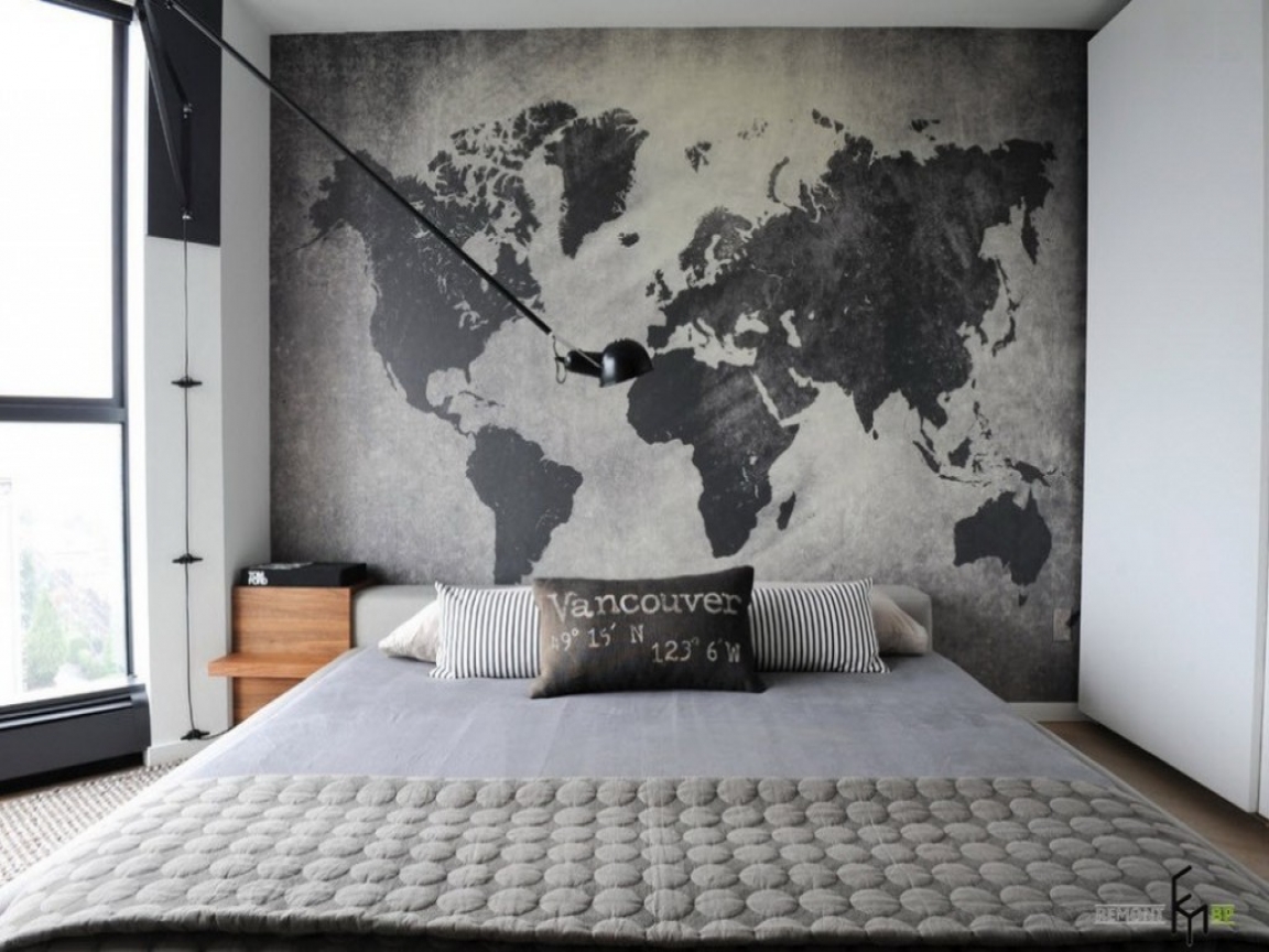 Description: A bedroom with a large bed and a large wall mural on the wall behind it.