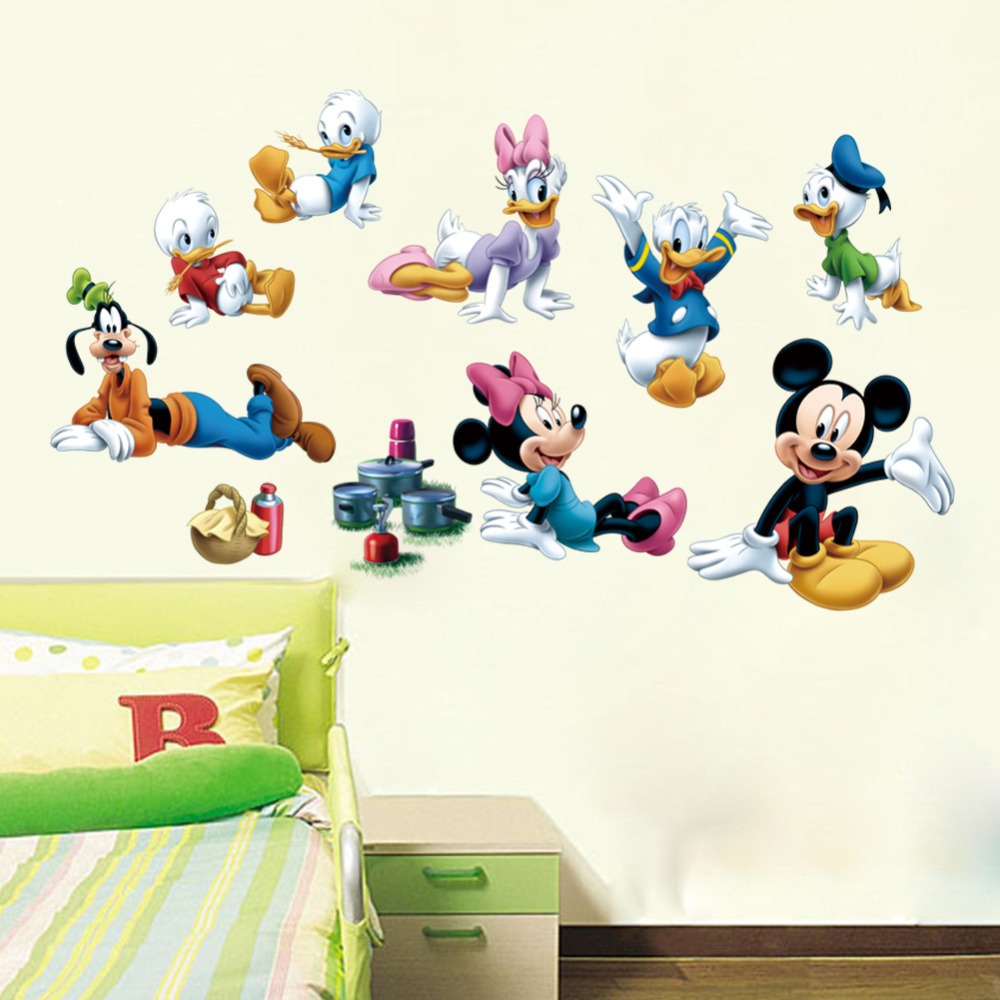 Description: A bedroom with a bed and a wall with mickey mouses on it and other cartoon characters on it.