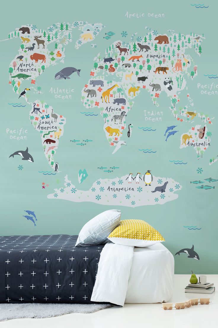 Description: A bedroom with a wall mural of animals and trees on it's wall.