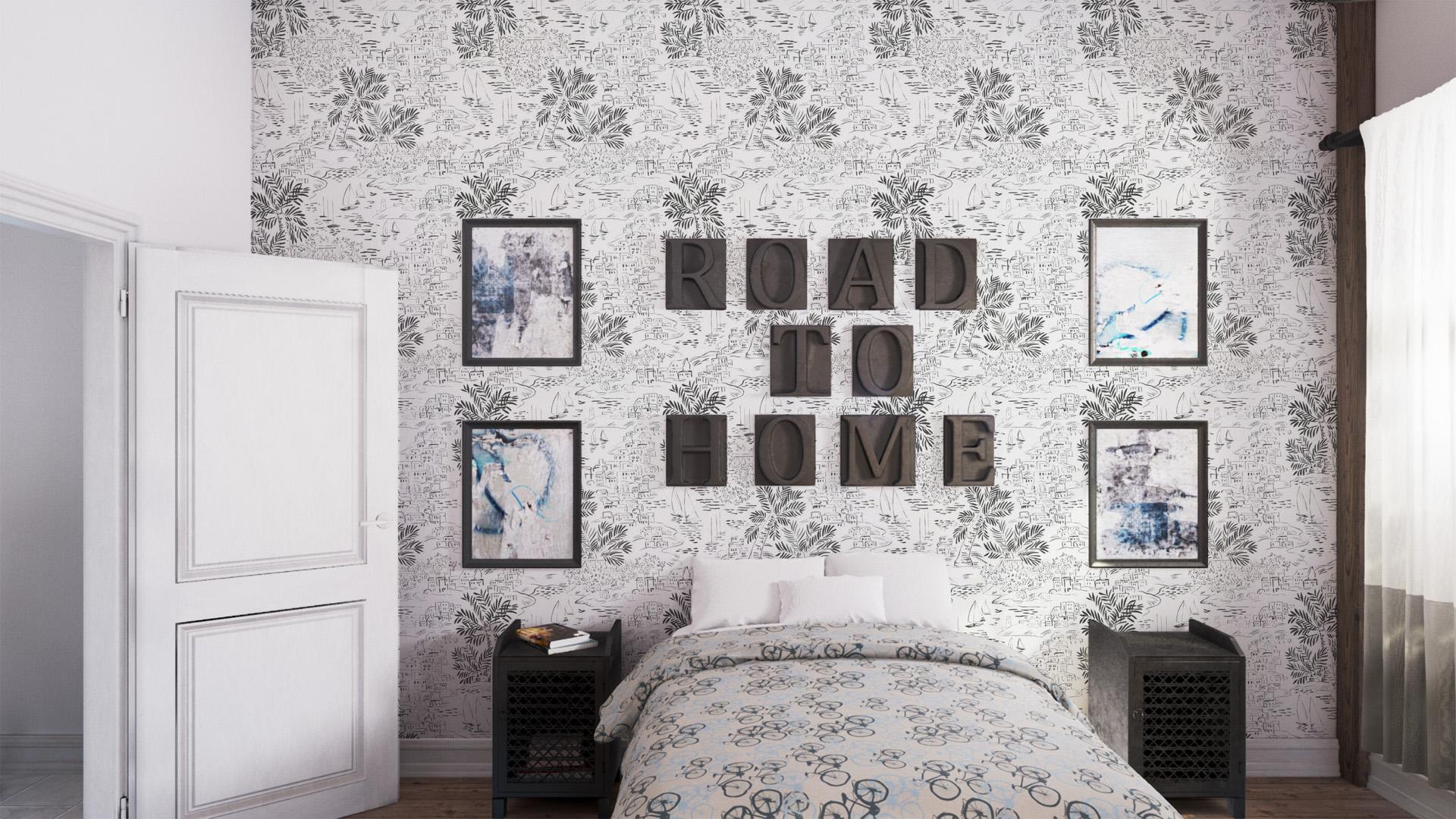 Description: A bedroom with a bed and a wall with pictures on it and a door to another room with a bed.