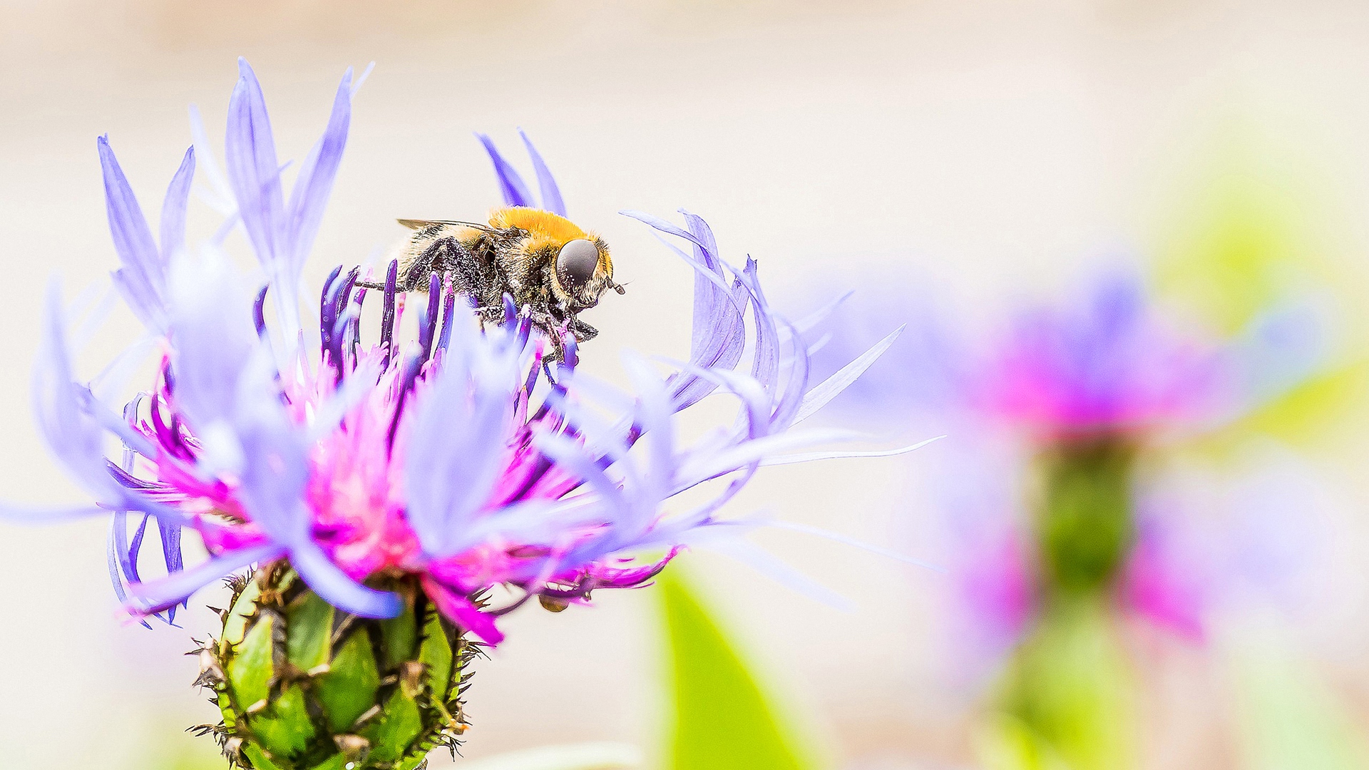 Description: A bee is sitting on a purple flower with a blurry background of purple flowers and green leaves in the foreground.