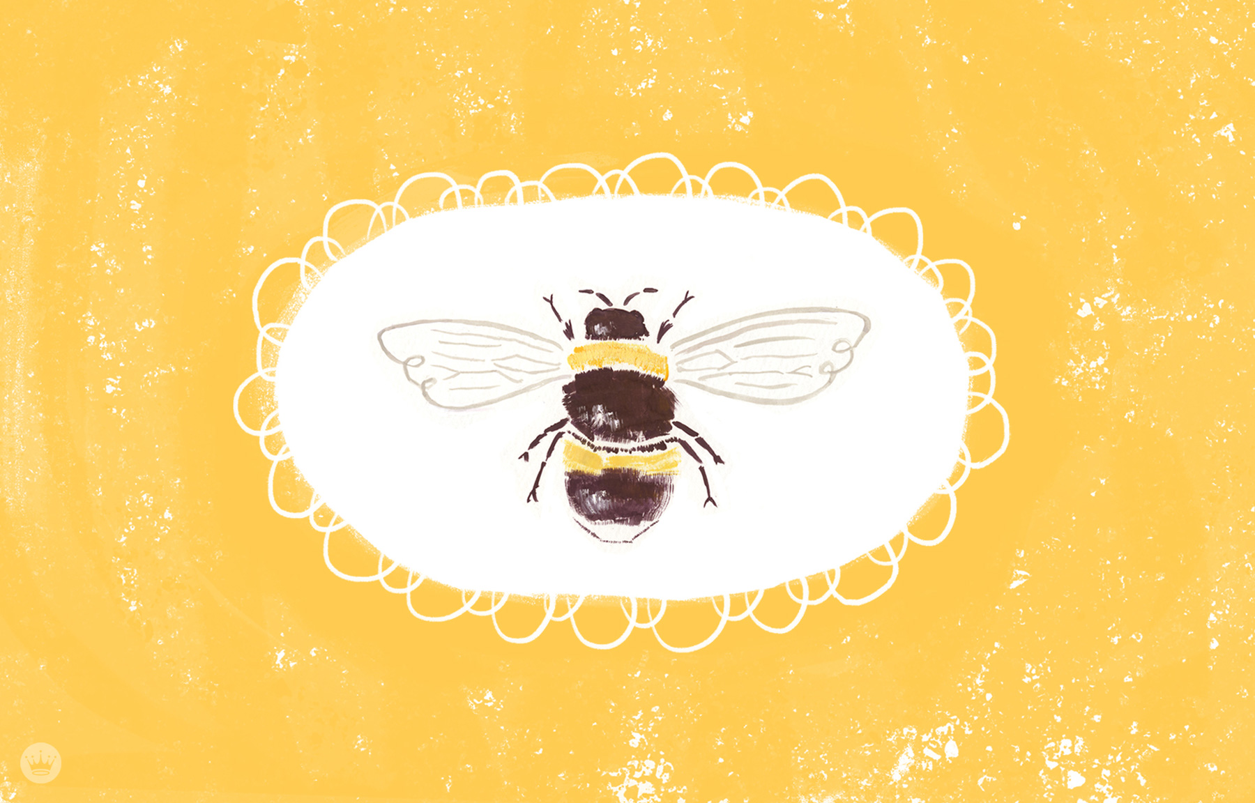 Description: A bee on a yellow background with a white circle around it and a black and yellow bee on the bottom.