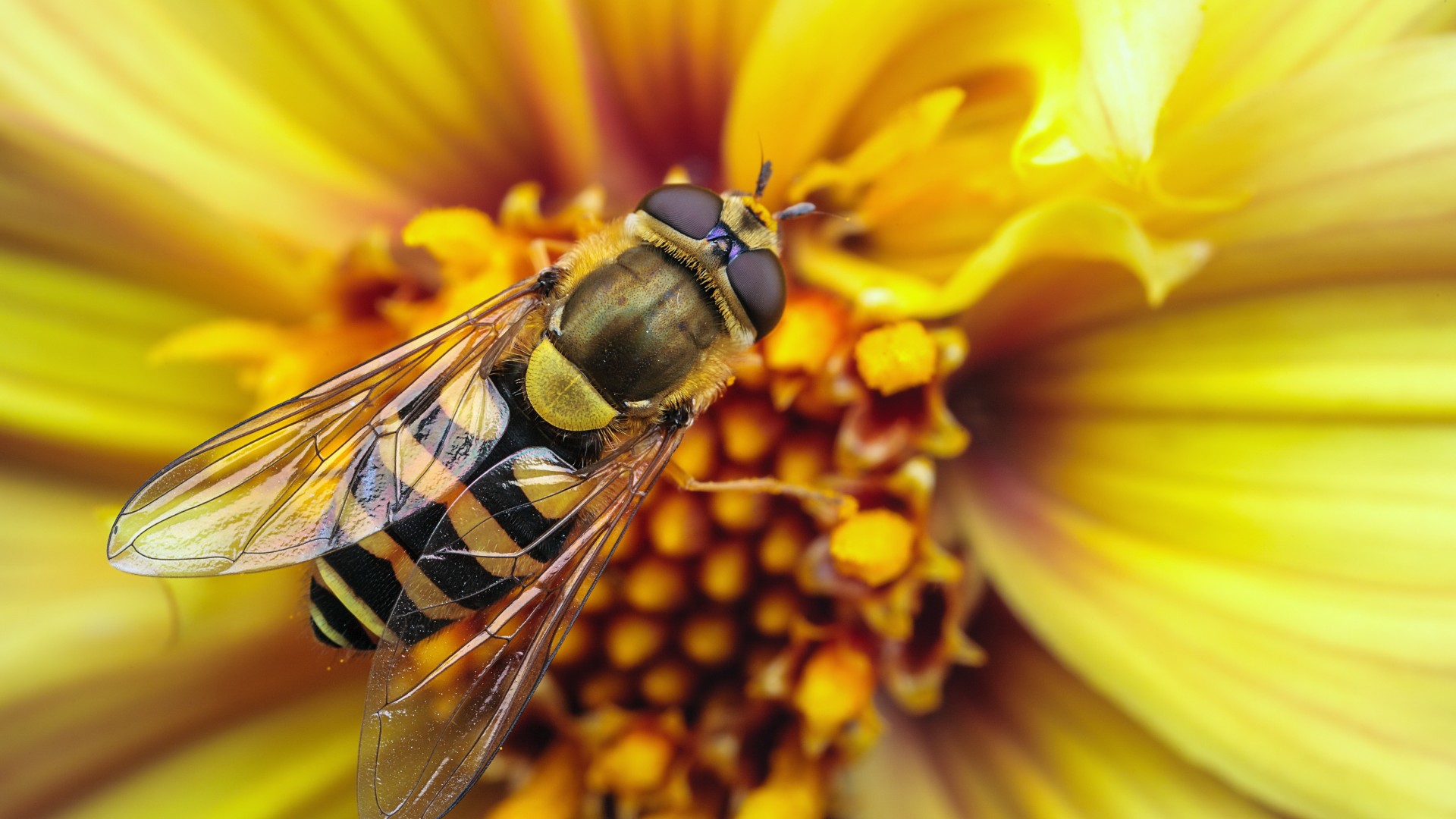 Description: A bee is sitting on a yellow flower with a black stripe on it's back end and a black and yellow stripe on its back end.