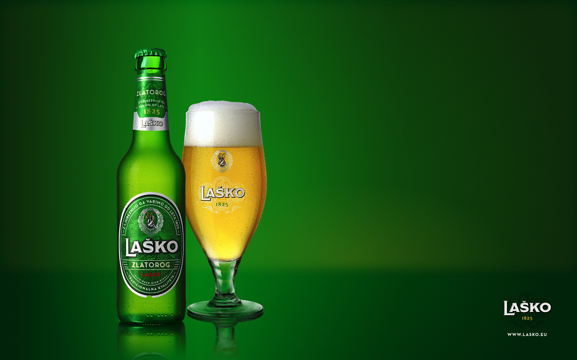 Description: A bottle of beer and a glass of beer on a green background with a green background and a green background.