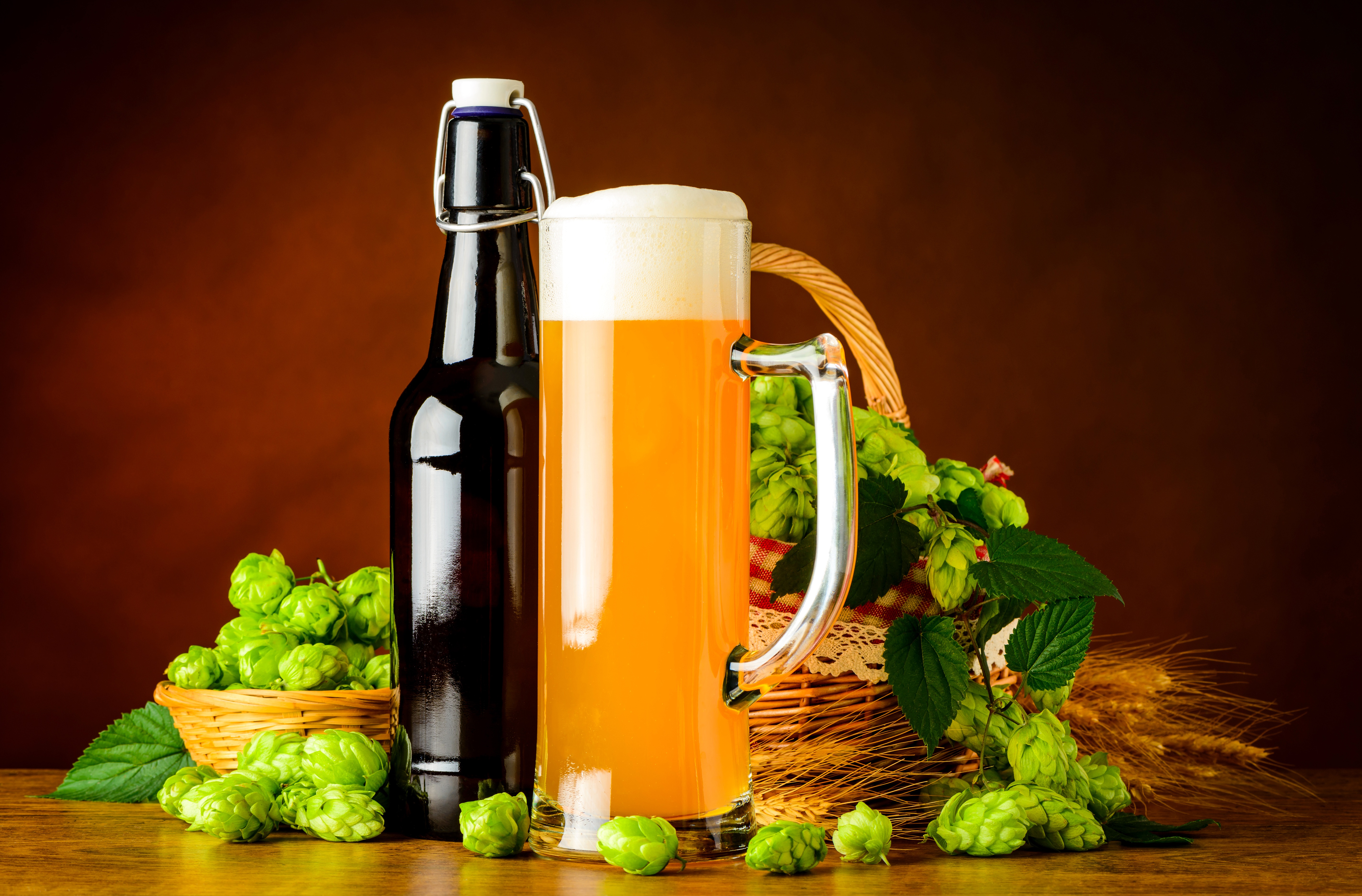 Description: A glass of beer next to a bottle of beer and hops of hops on a table with a basket of hops.
