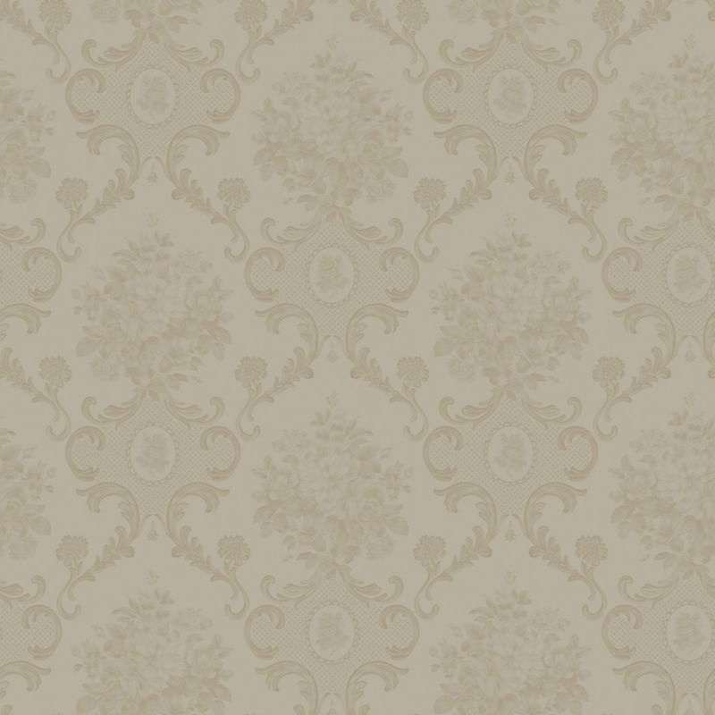 Description: A beige wallpaper with a floral design on it's side and a white background with a light brown border.