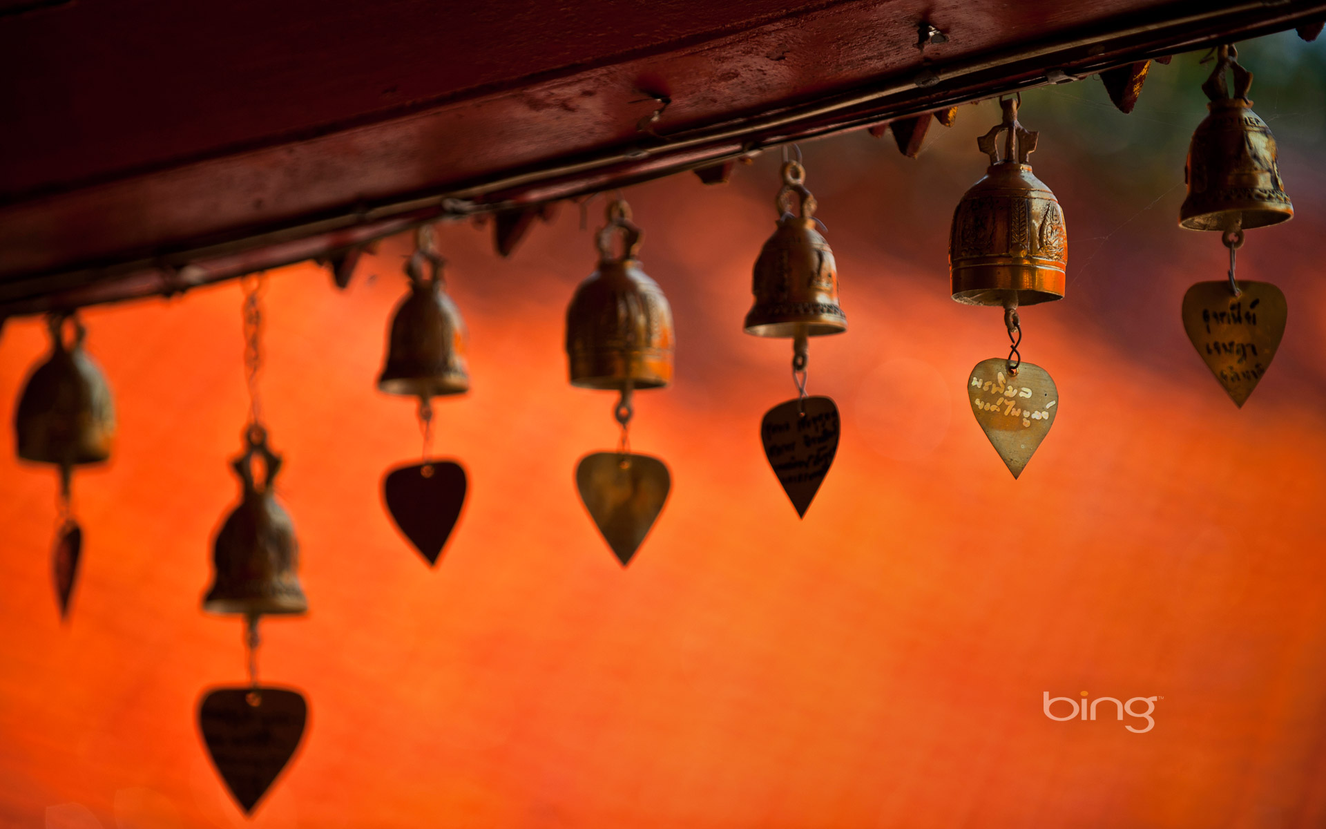 Description: A bunch of bells hanging from a wooden beam with a red background behind them and a sign that says.