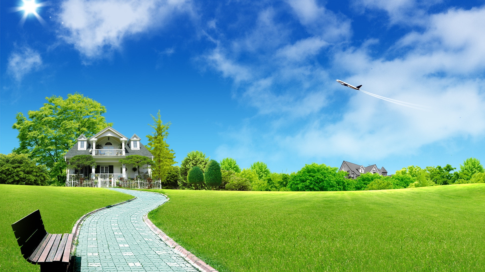Description: A bench sitting on a brick path in a field with a house in the background and a bird flying overhead.