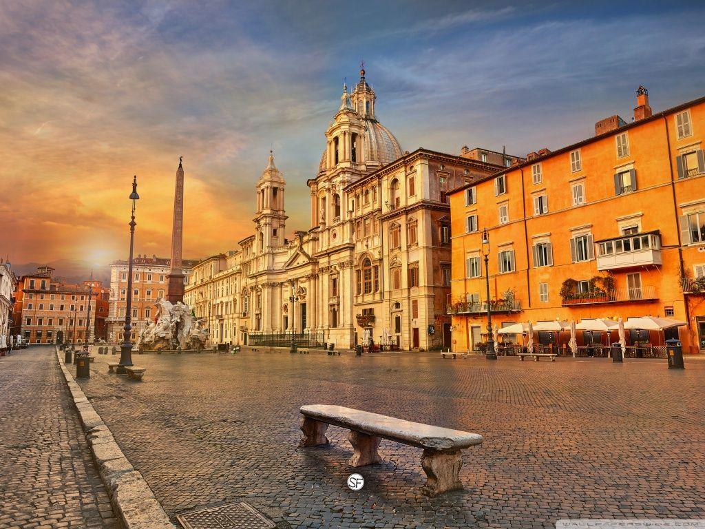 Description: A bench sitting on a cobblestone street in front of a building with a dome on top of it.