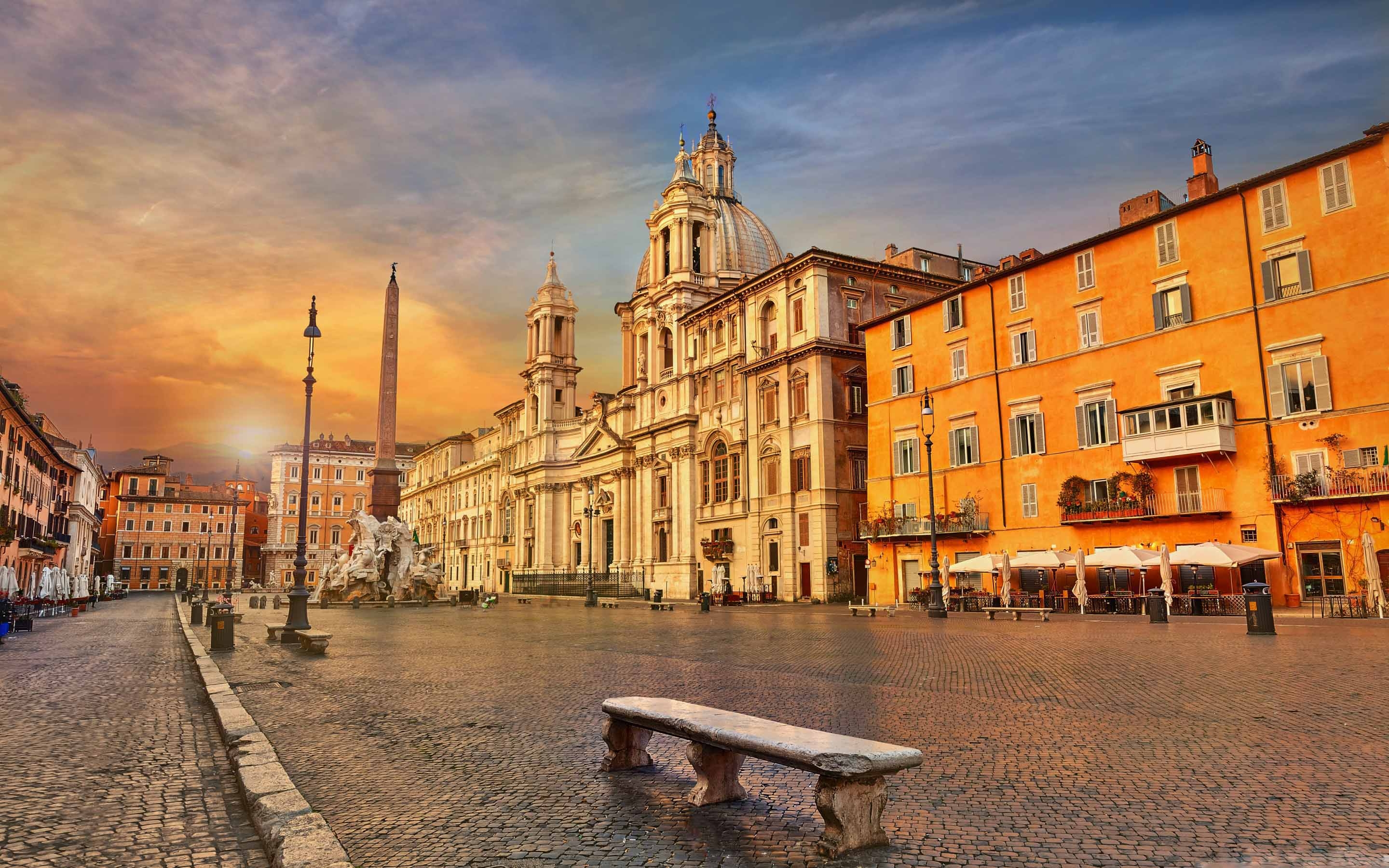 Description: A bench sitting on a cobblestone street in front of a tall building with a clock tower on top.