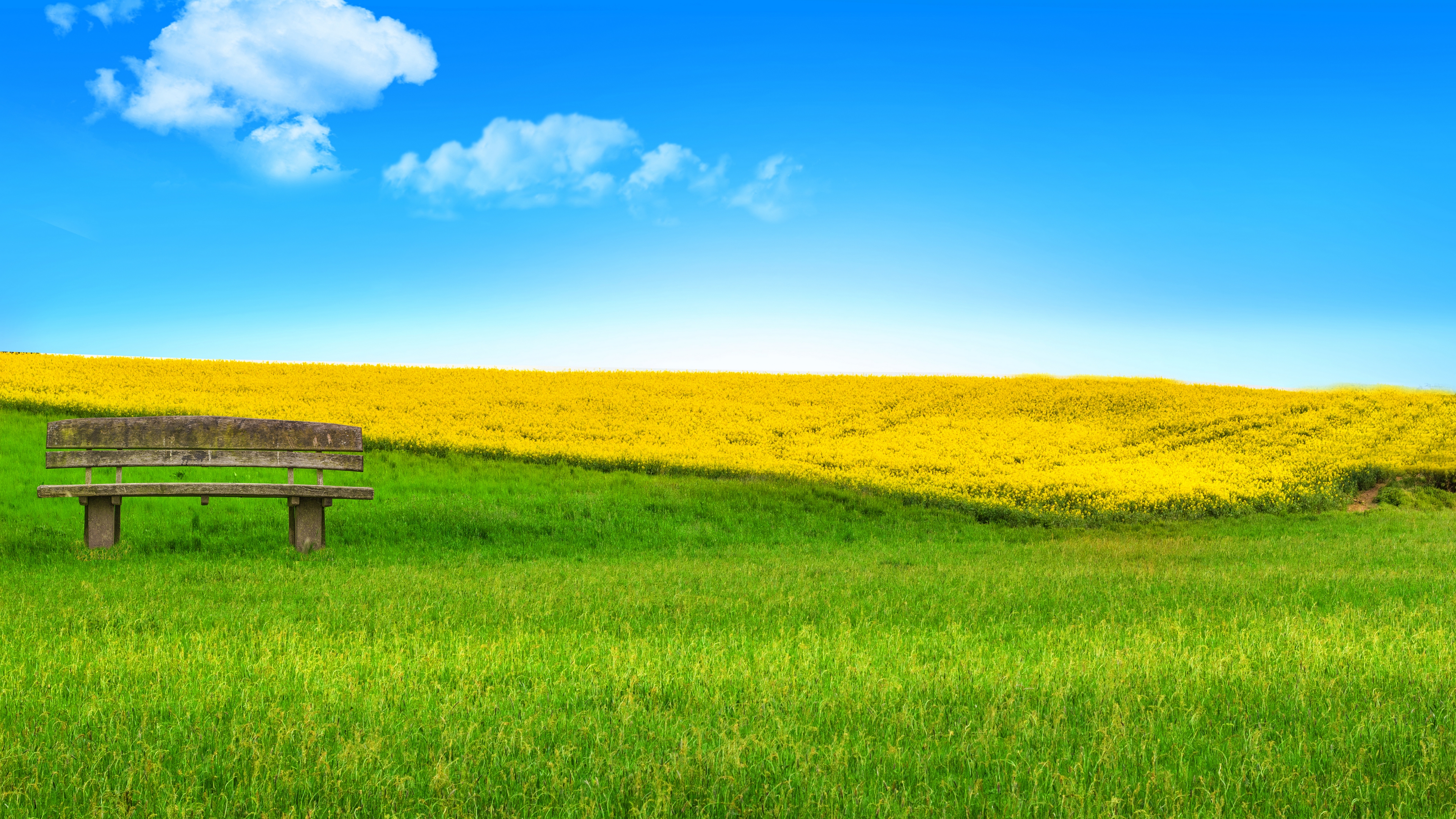 Description: A bench in a field of green grass and a blue sky with clouds above it and a field of yellow flowers.