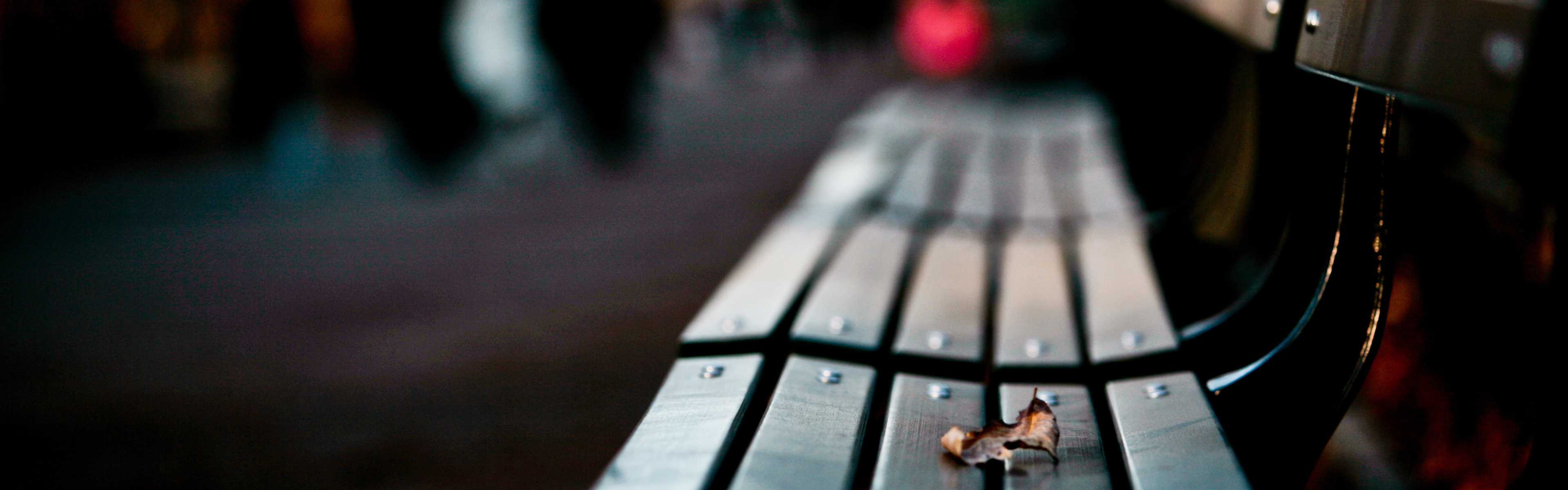 Description: A bench with a small dog on it's side in a public area with people walking by and a person walking by.