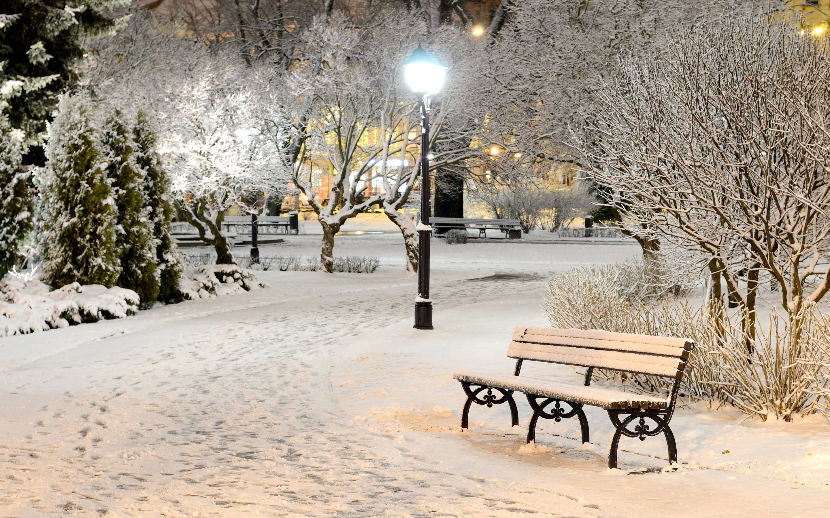 Description: A bench in a snowy park at night with a street light in the background and snow covered trees and bushes.
