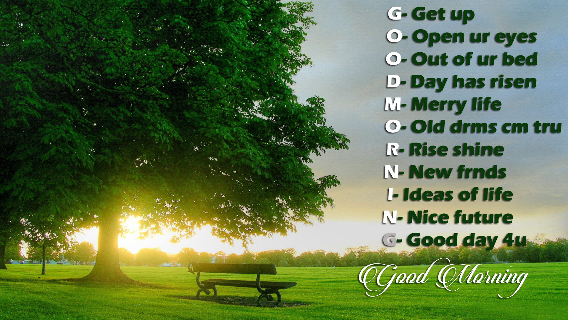 Description: A bench sitting under a tree in a park with a poem written in the middle of it that reads good morning.