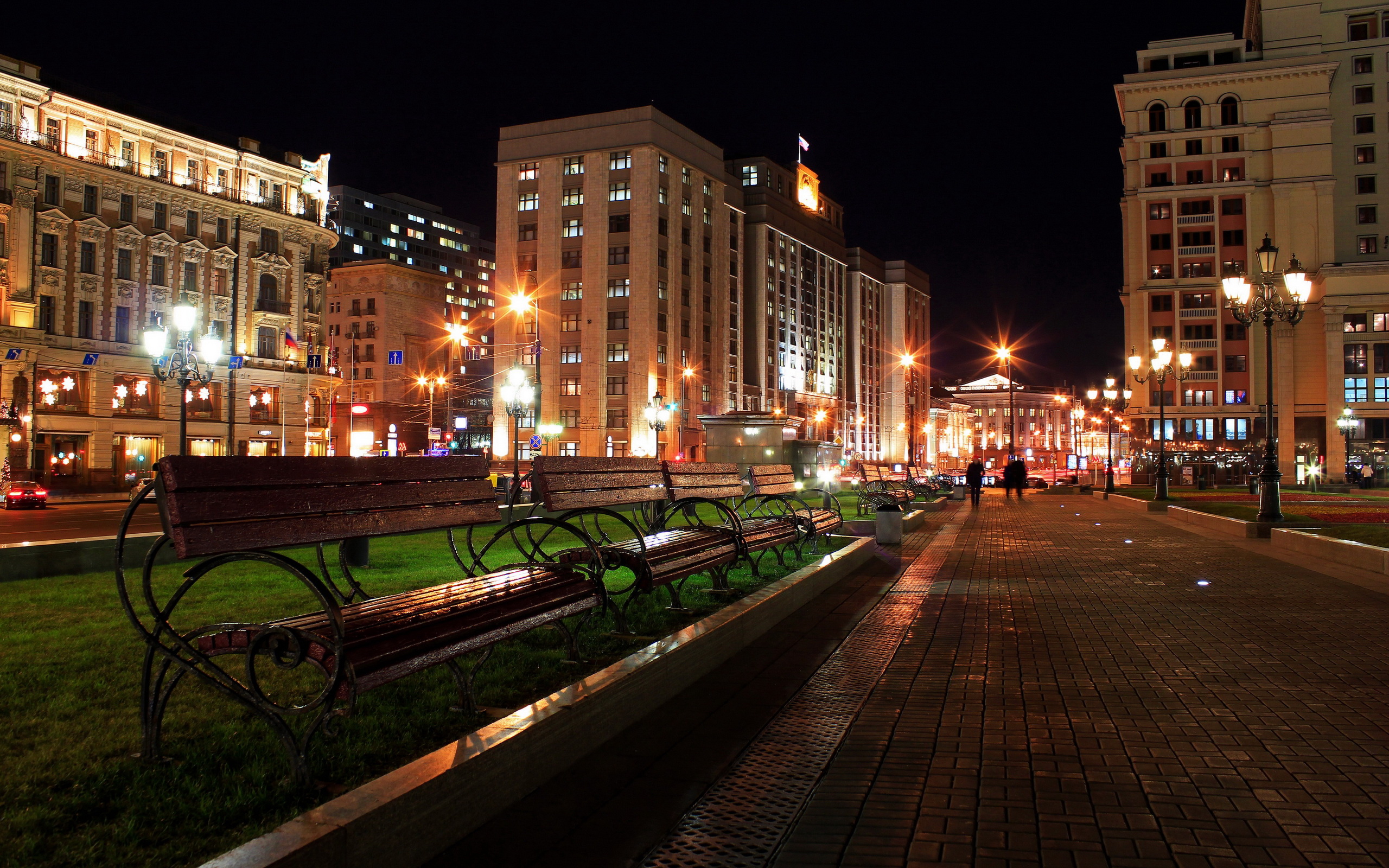 Description: A row of benches sitting on top of a sidewalk next to tall buildings at night time with street lights.