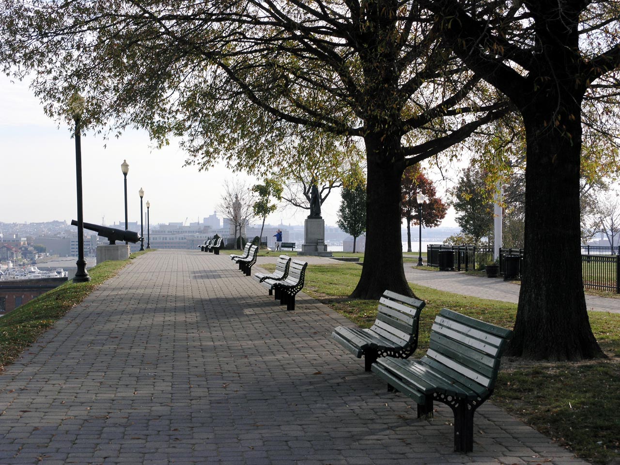 Description: A row of benches sitting next to a tree filled park next to a river with a city in the background.