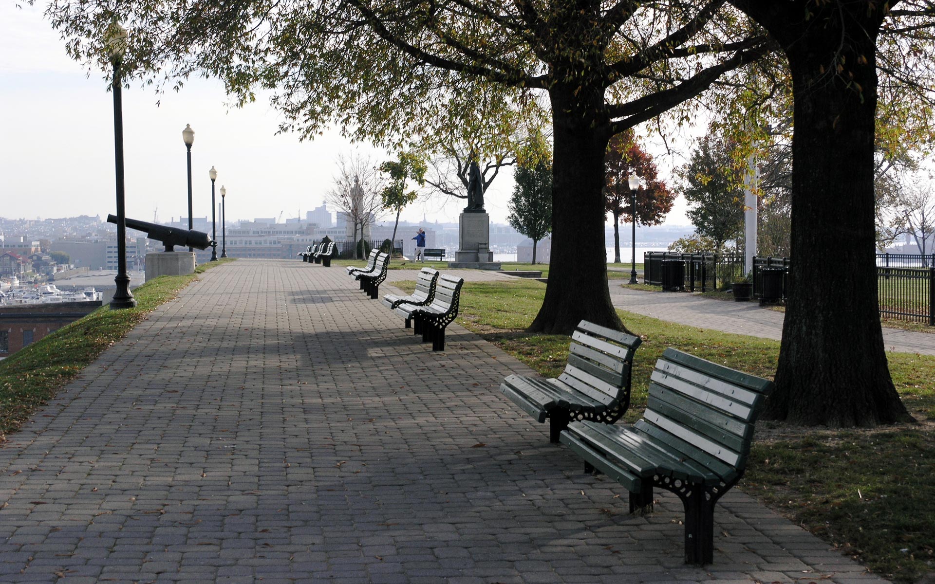 Description: A row of benches sitting next to a tree filled park next to a river and a city skyline in the background.