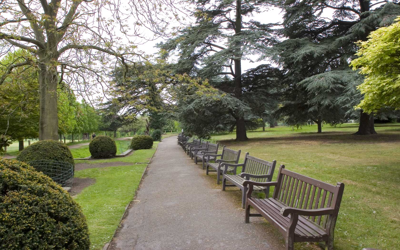 Description: A row of benches sitting next to a park filled with trees and bushes on a sidewalk next to a sidewalk.