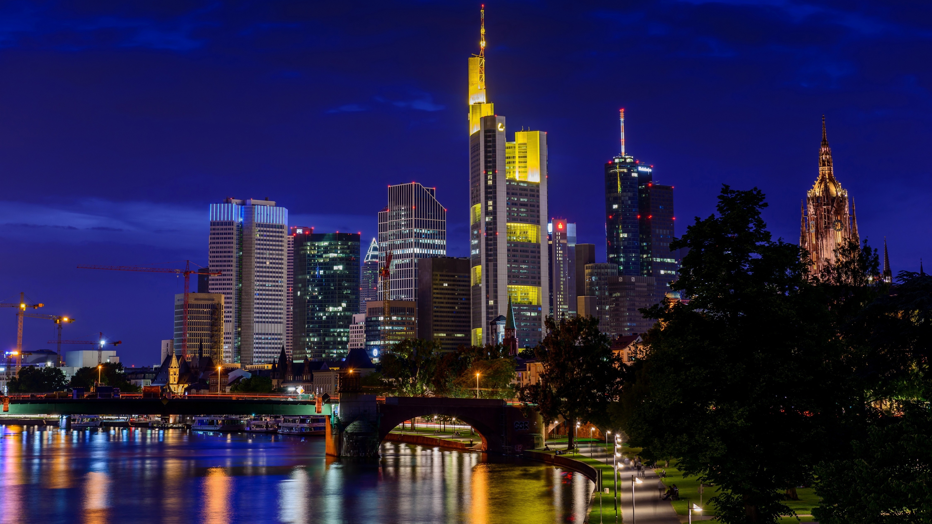Description: A city skyline with a bridge and a river at night with lights reflecting off the water and a bridge in the foreground.