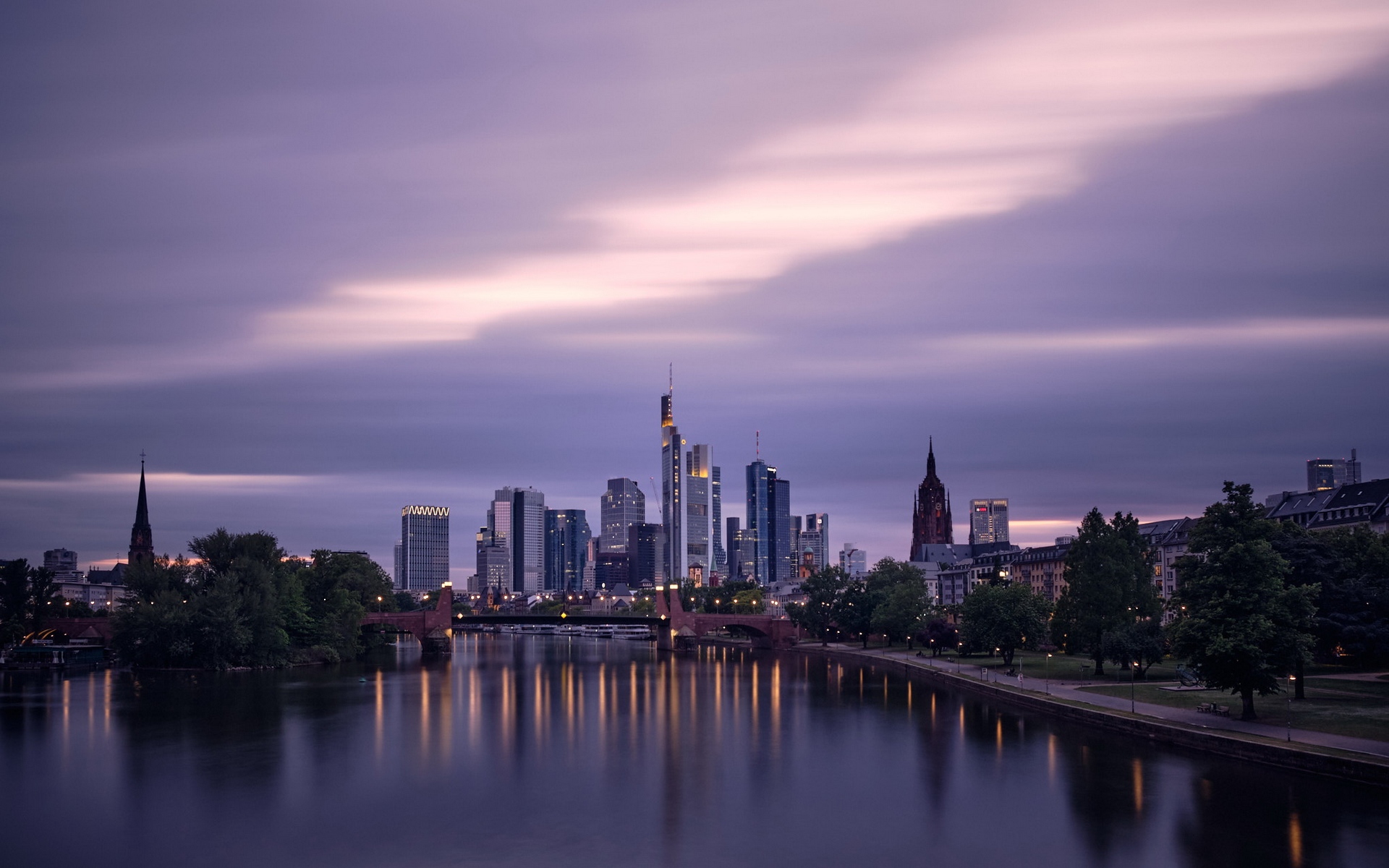 Description: A city skyline is seen at dusk over a river with a bridge and a bridge in the foreground.