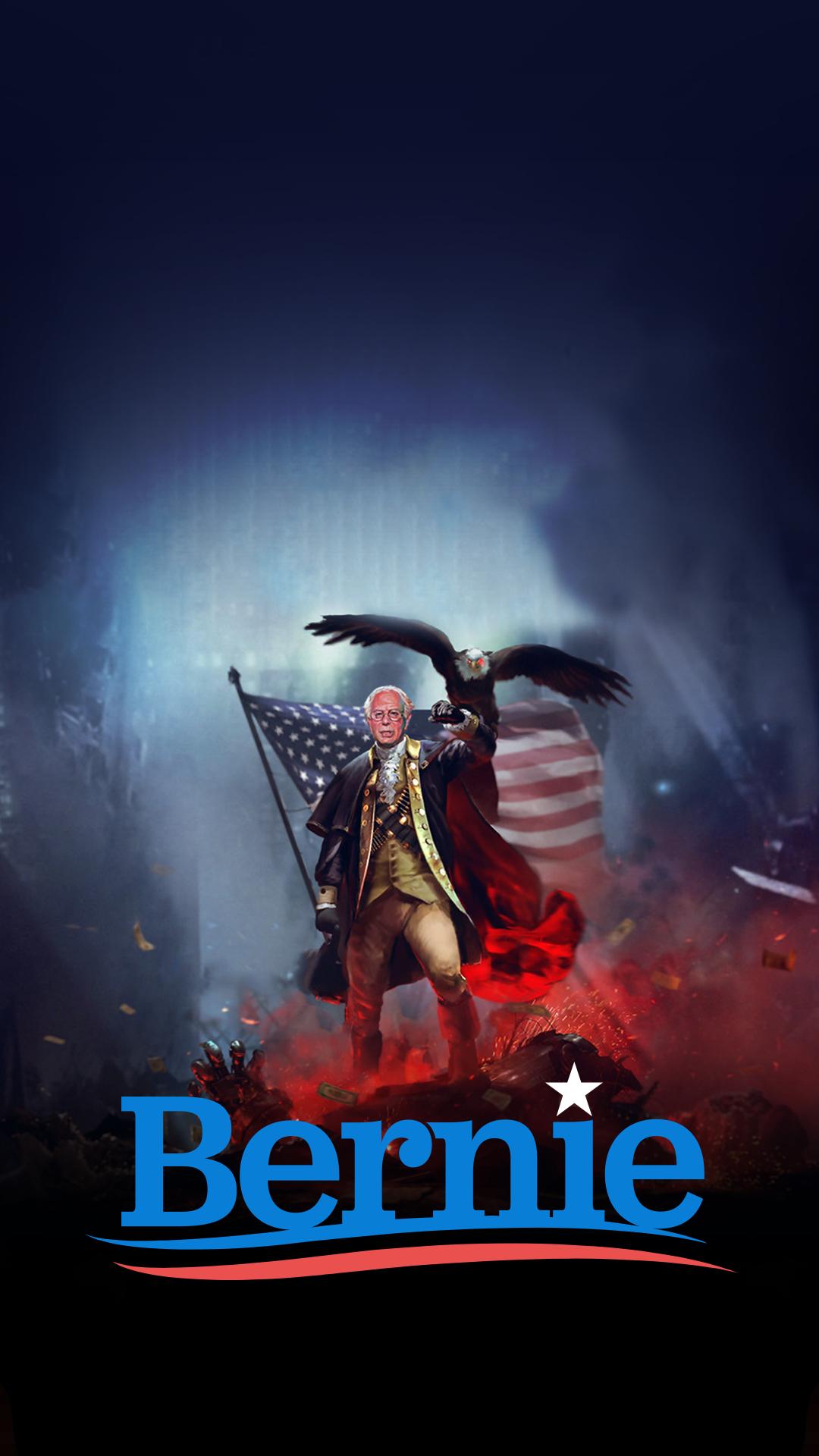 Description: A poster of a man holding a flag and an eagle with the words bernie on it.