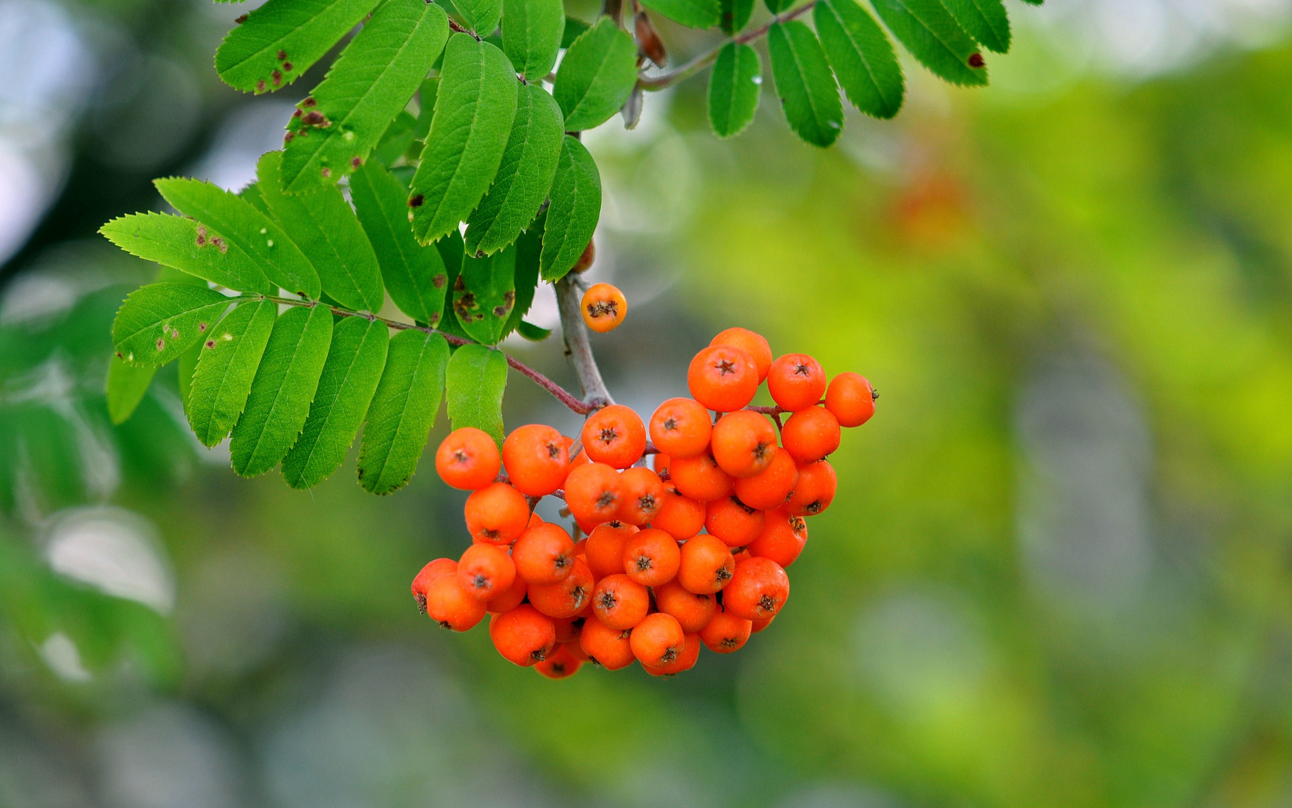 Description: A bunch of berries hanging from a tree branch with leaves around them and a blurry background of trees.