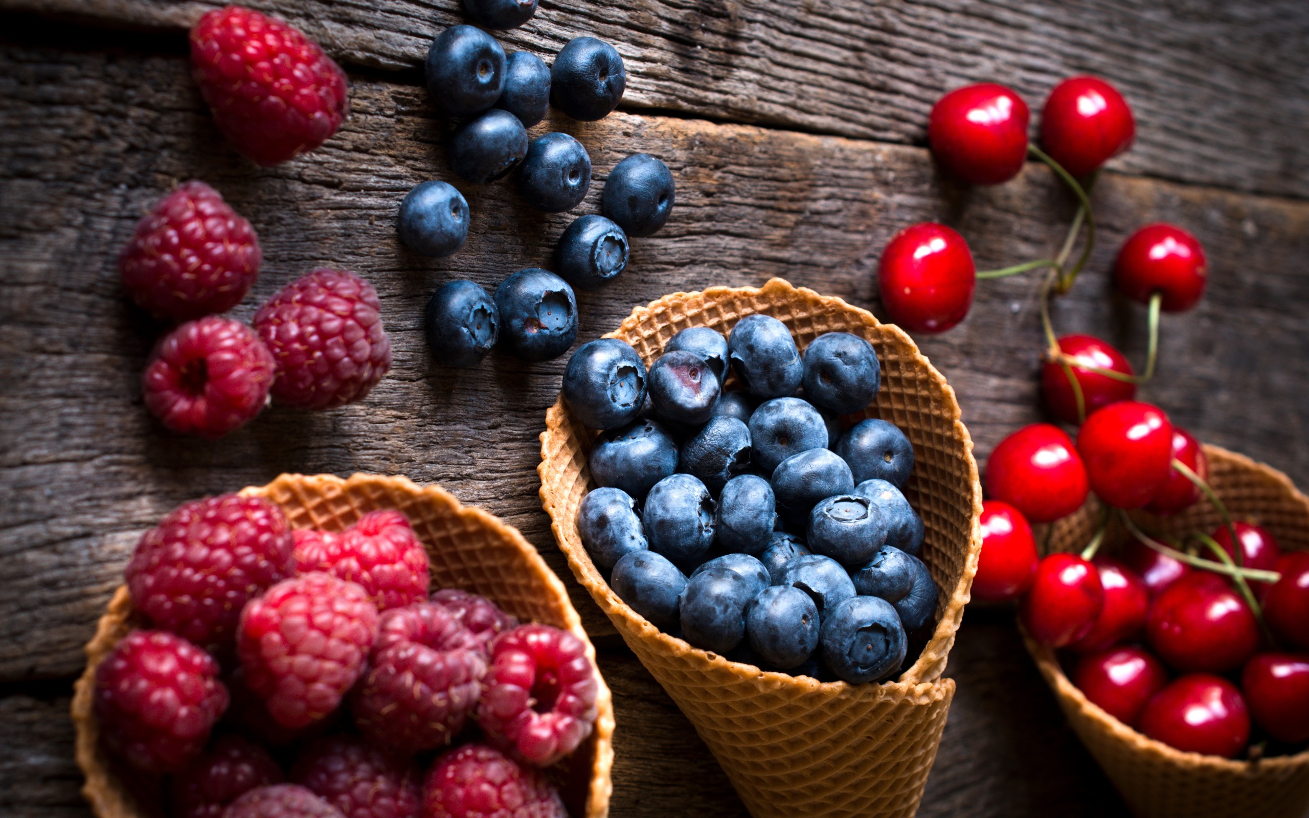 Description: A table topped with baskets of berries and a cone of ice cream next to a pile of raspberries.