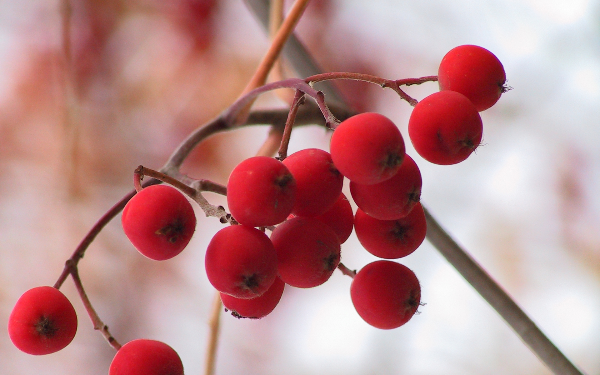 Description: A bunch of berries hanging from a tree branch with leaves in the background and a blurry background behind them.