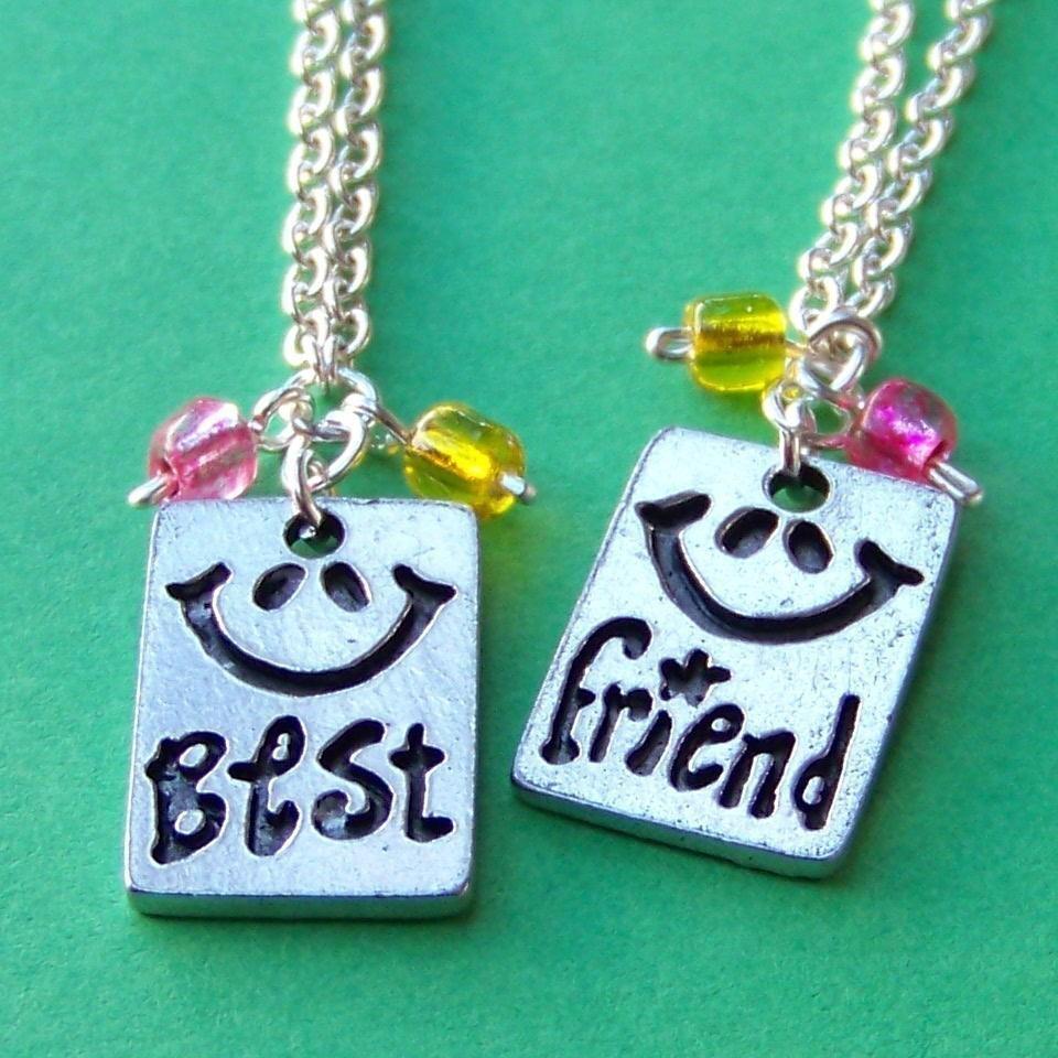 Description: Two necklaces with the words best friend and a smile on them on a green surface with a chain.
