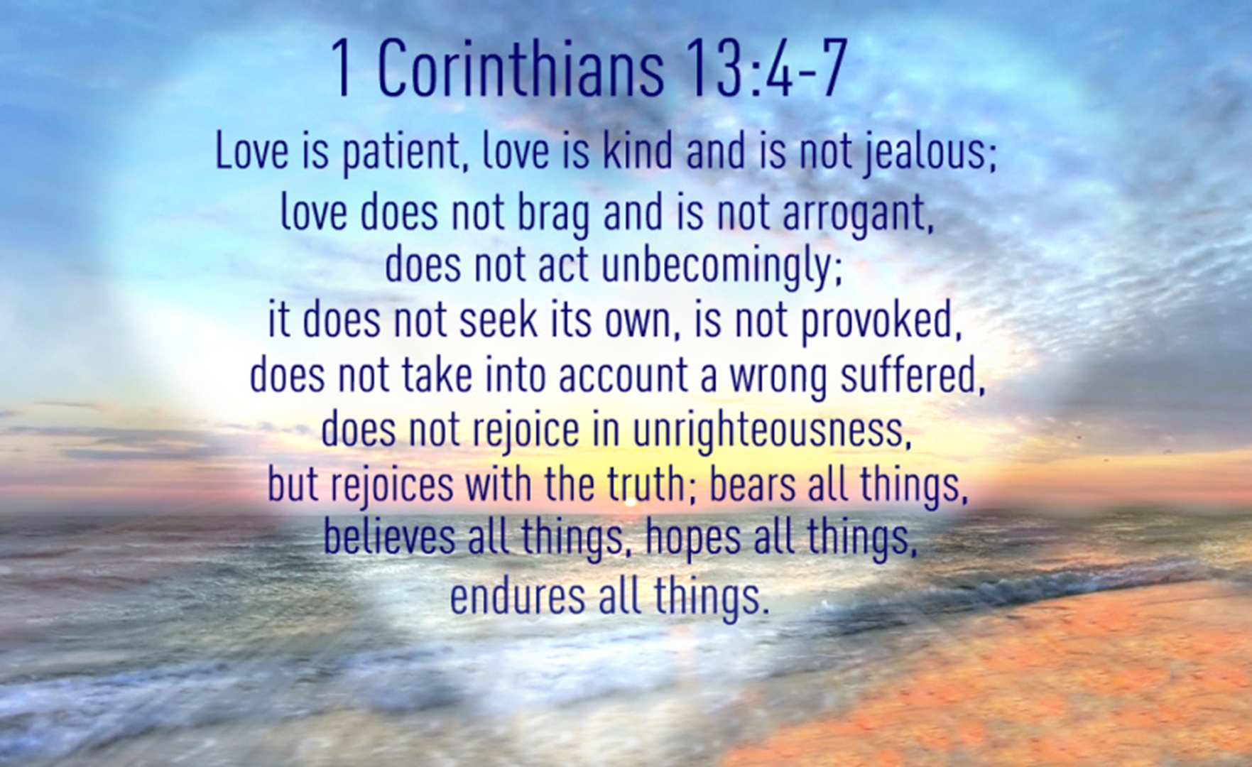 Description: A picture of a quote from a bible about love and affection with a picture of a heart in the background.