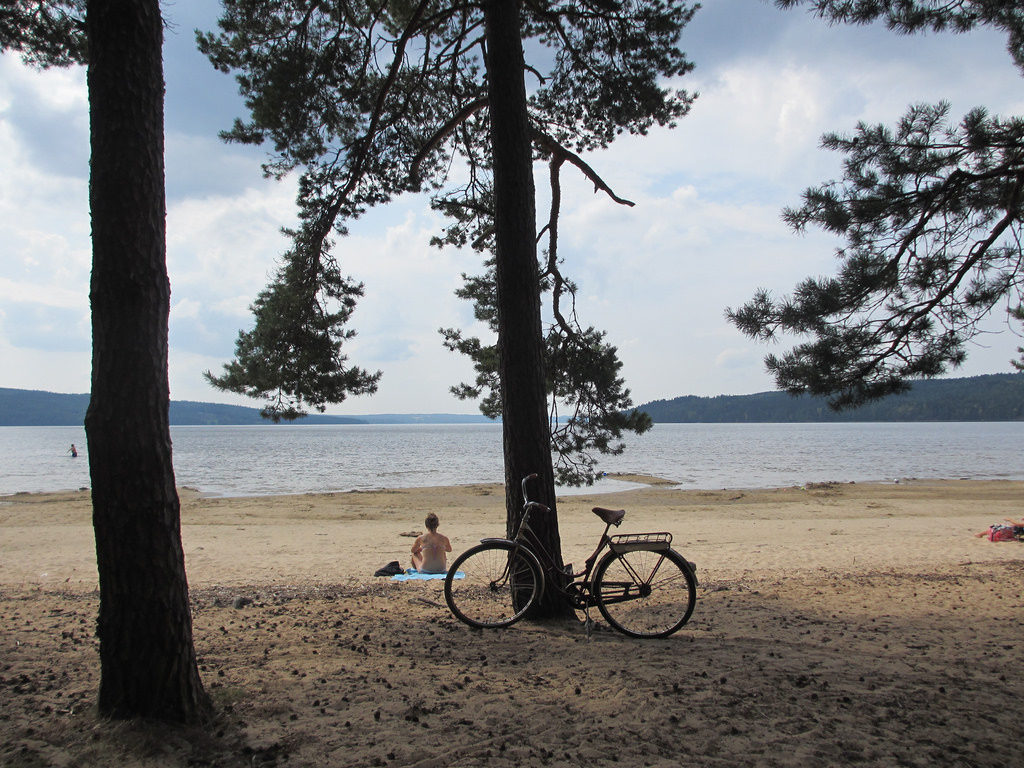 Description: A bicycle parked next to a tree on a beach near the ocean and people laying on the sand under the trees.