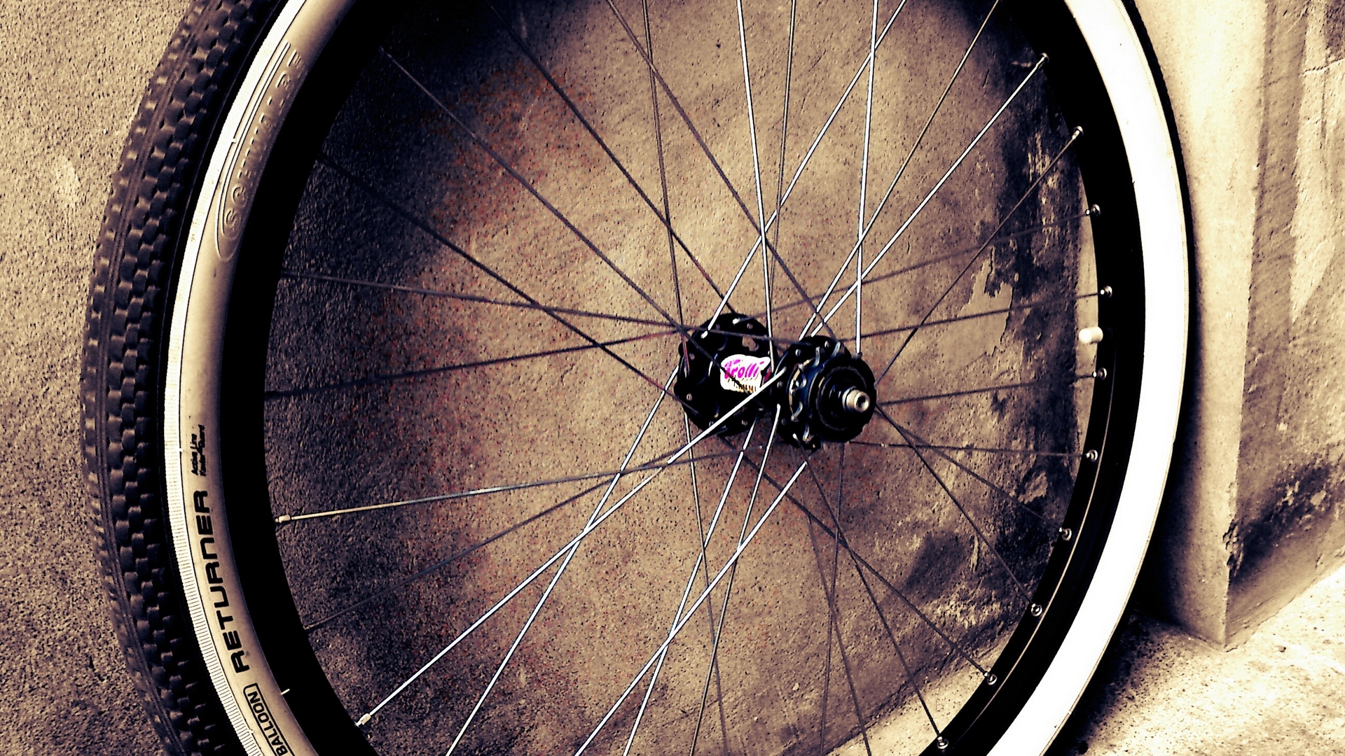 Description: A bicycle wheel is shown on a wall with a pink heart on it's spokes and a black and white tire.