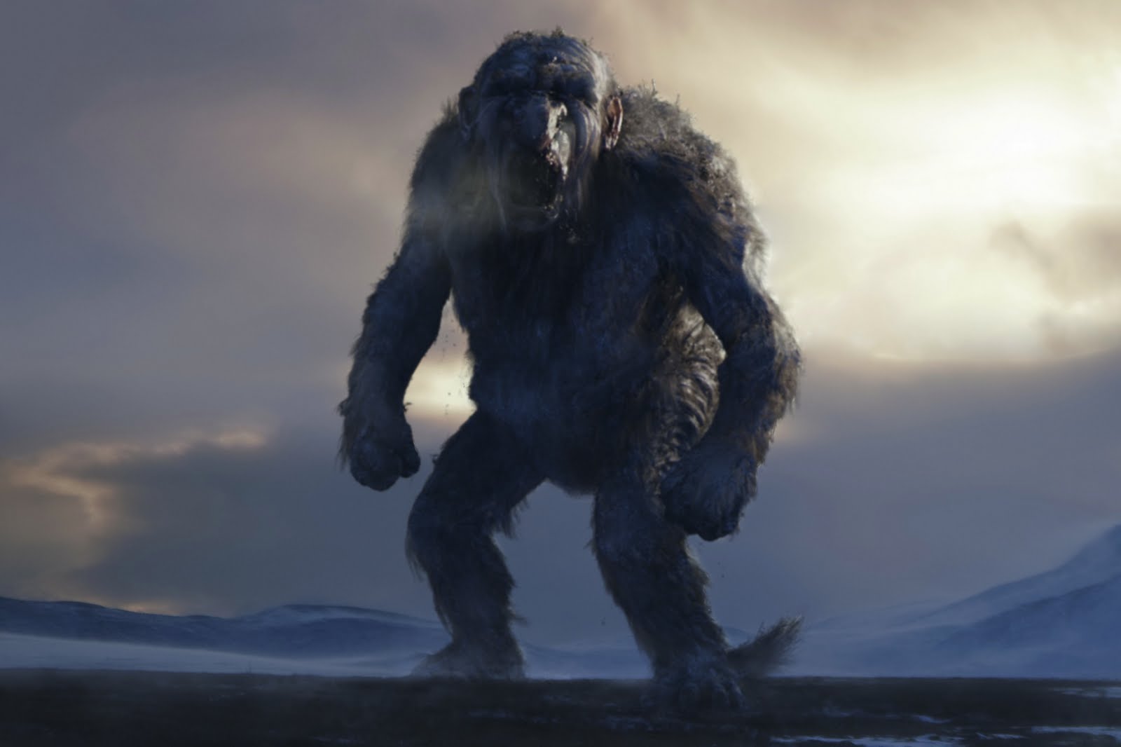 Description: A bigfoot standing in the middle of a field with mountains in the background and clouds in the sky.