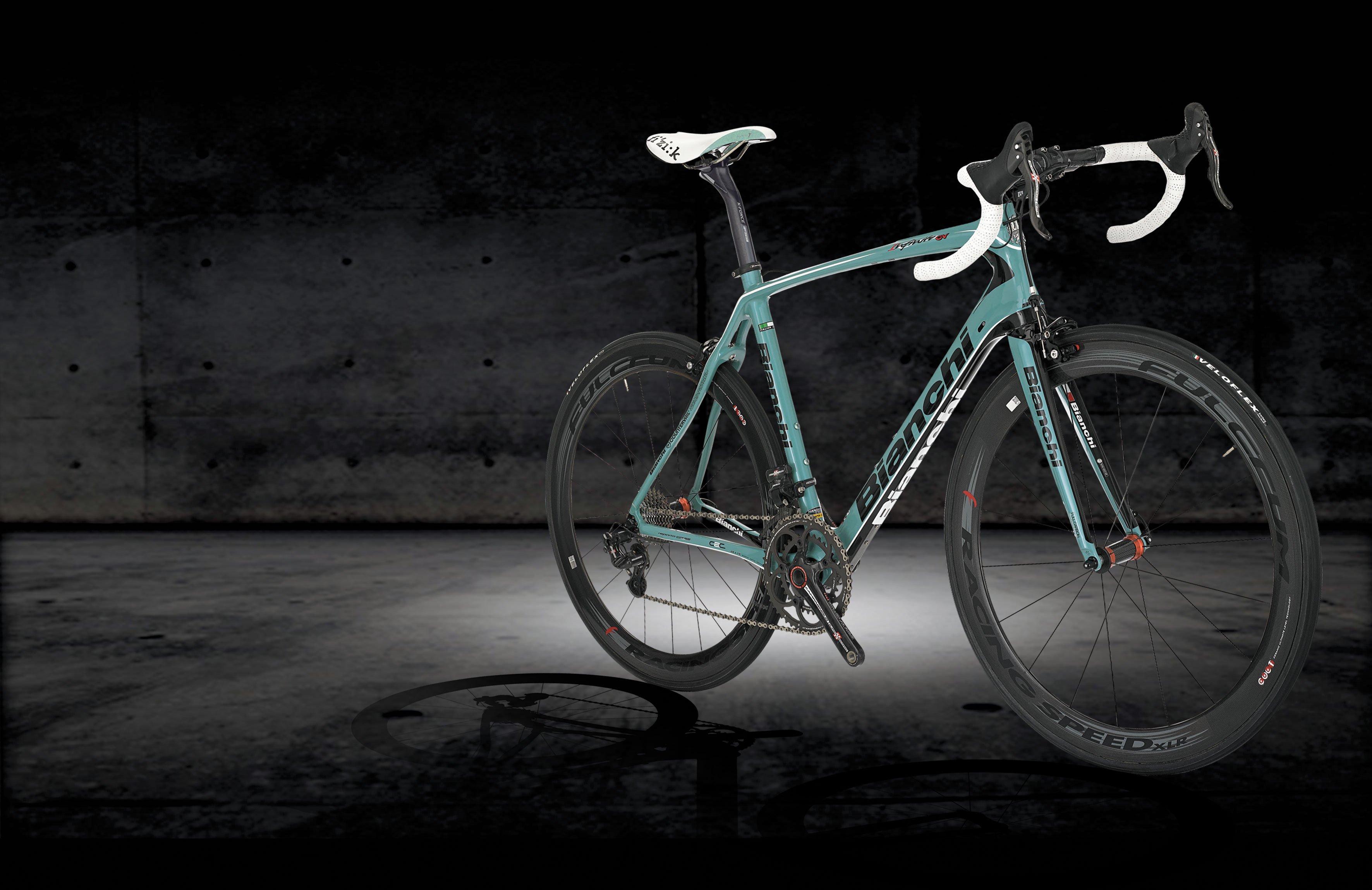 Description: A bike is shown in a dark room with a light on it's front wheel and seatposts.